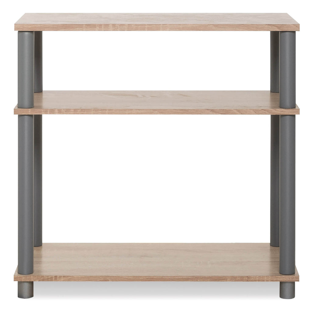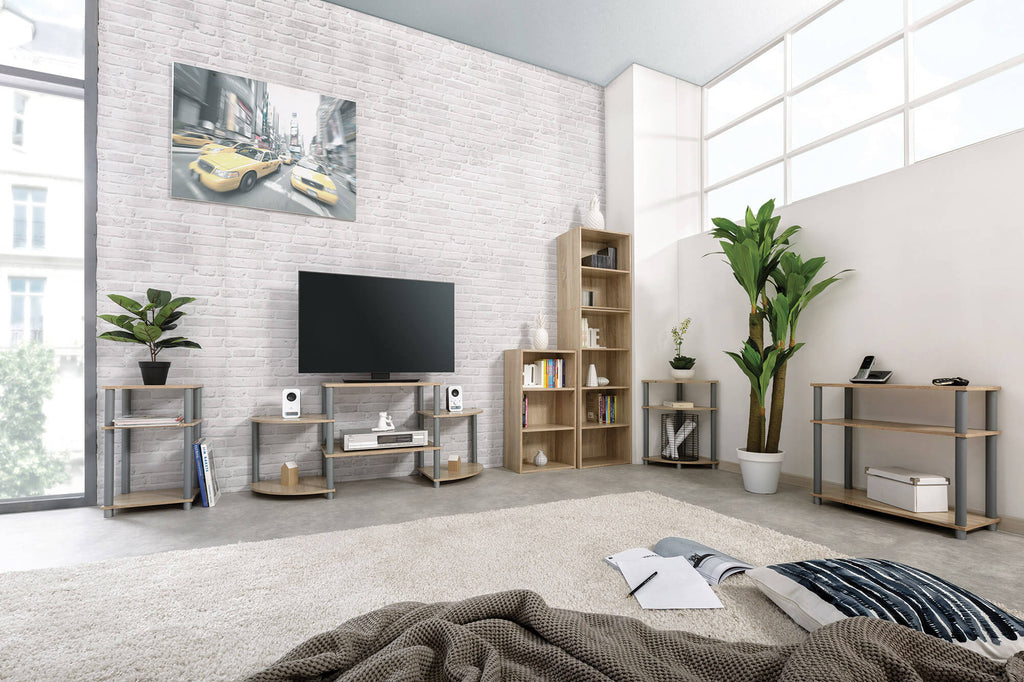 Regal (TV-Ständer) aus 12/15 mm Spanplatte mit eichenfarbener Melaminbeschichtung und grauen Hartplastikrohren. Ideal für junge und funktionale Umgebungen, Made in Germany.