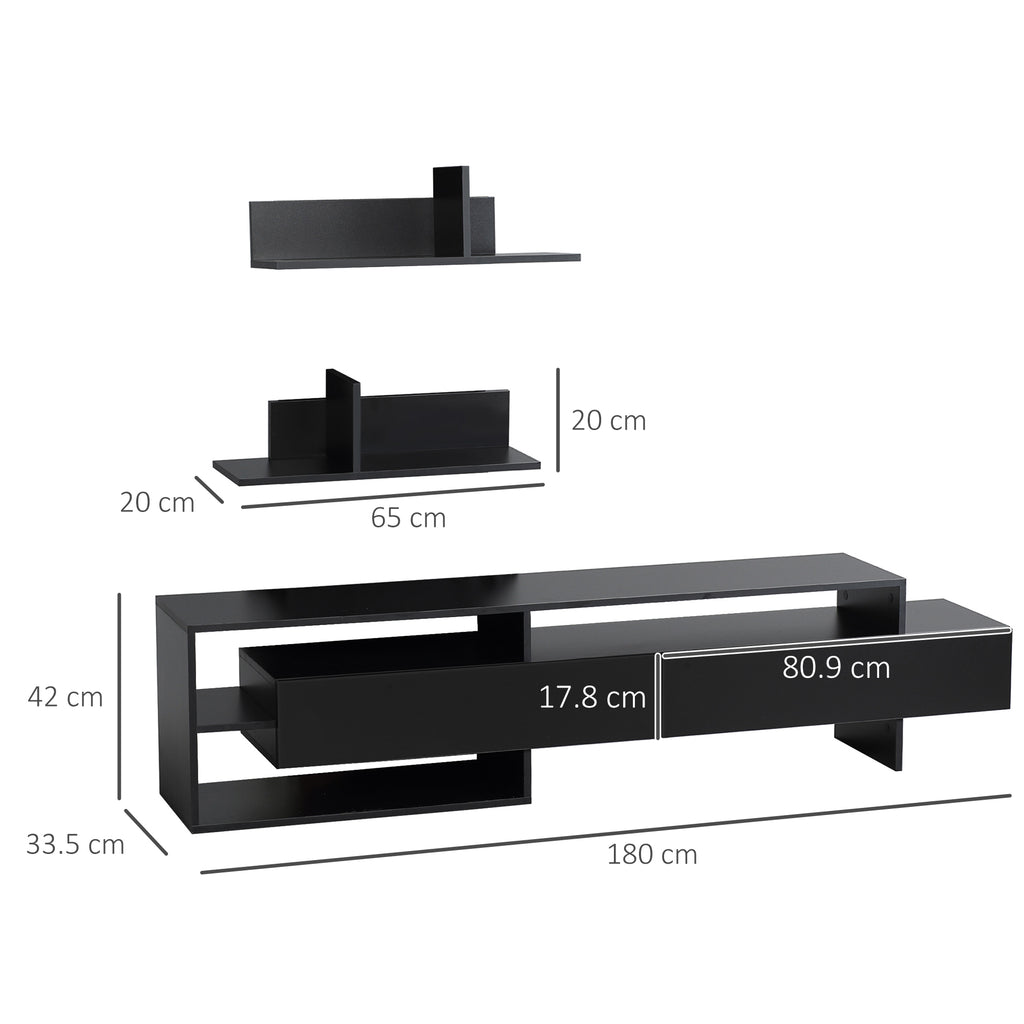 - ABMESSUNGEN: Abmessungen des TV-Schranks: 180 L x 33,5 T x 42 H cm. Regalabmessungen: 65 L x 20 T x 20 H cm. Belastbarkeit: 60 kg (TV-Schrank), 20 kg (Regale). Montage erforderlich
