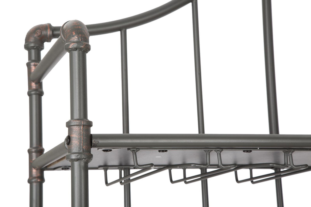 Schrank mit Flaschenhalter und Glashalter aus Metall und MDF. Prächtiges Industriezubehör, das sich problemlos in Ihr Wohnzimmer oder Ihren Geschäftsraum einfügt. Holz und Eisen kommen in ihrer modernsten Form zum Ausdruck