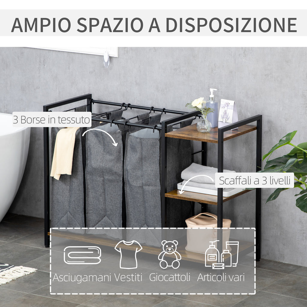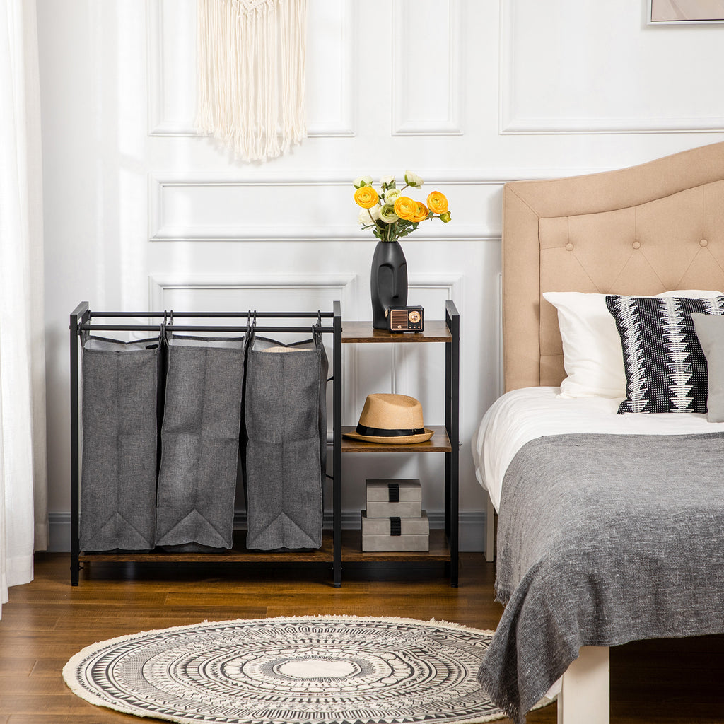 Organisieren Sie Ihre Wäsche optimal mit dem Wäscheschrank. Es verfügt über 3 praktische Stofftaschen, um Ihre Kleidung zu trennen und das Waschen zu erleichtern, und Sie können sie mühelos bewegen, um sie dorthin zu bringen, wo Sie sie brauchen. Die praktische Seitenablage mit 3 Einlegeböden bietet Platz für Ihre Essentials. Die Stahl- und Holzstruktur ist widerstandsfähig gegen den täglichen Gebrauch und die verstellbaren Füße sorgen für Stabilität.