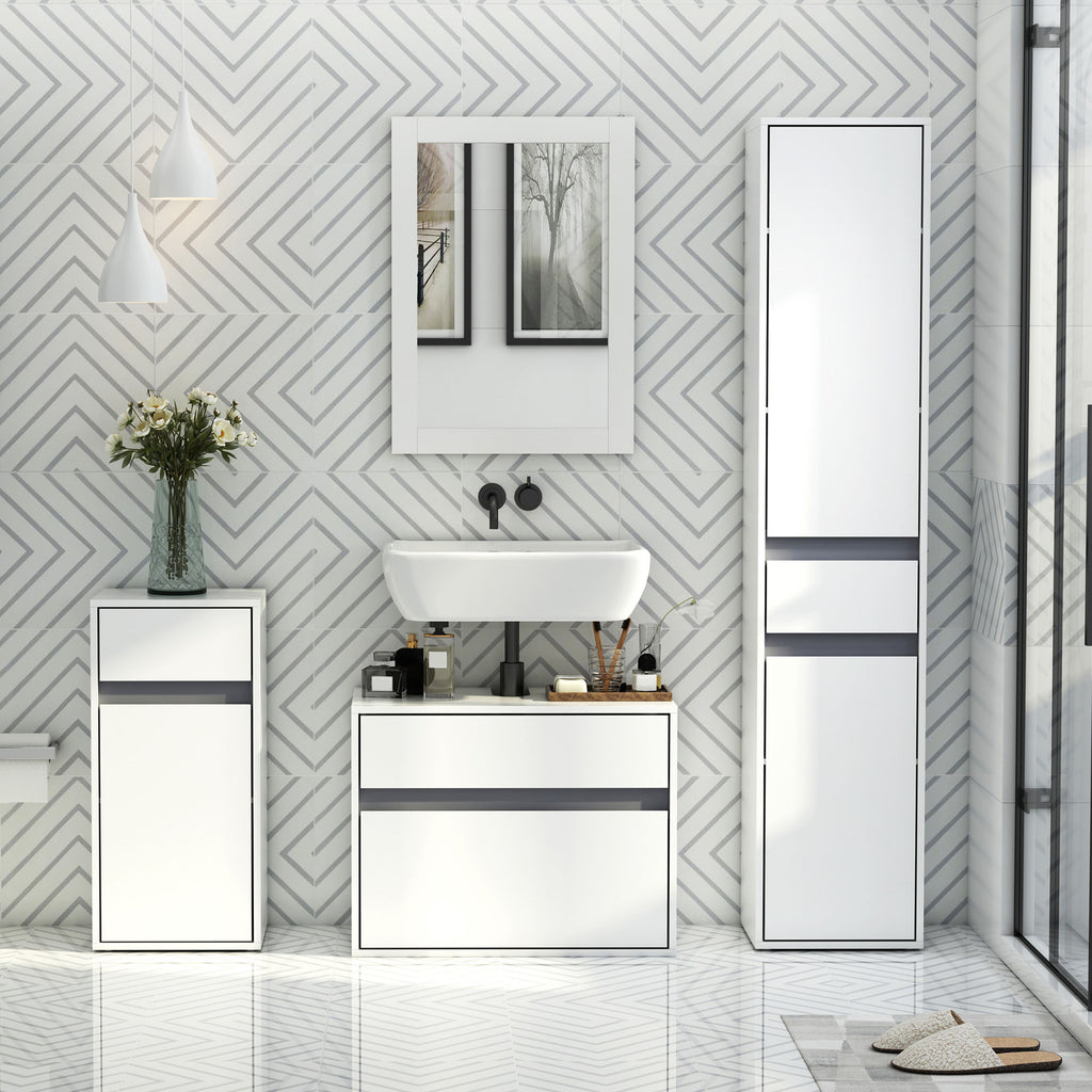 Mit Vanity Cabinet macht es Ihr Badezimmer gut sauber und aufgeräumt. Der elegante Stil und die weiße Farbe integrieren sich leicht in die Umgebung. Hergestellt aus MDF und Spanplatten für Stabilität, mit einem U-Schnitt, der es ermöglicht, sich eng um Waschbecken und Rohre zu schmiegen. Schubladen in verschiedenen Größen können Ihre verschiedenen Sortieranforderungen erfüllen.
