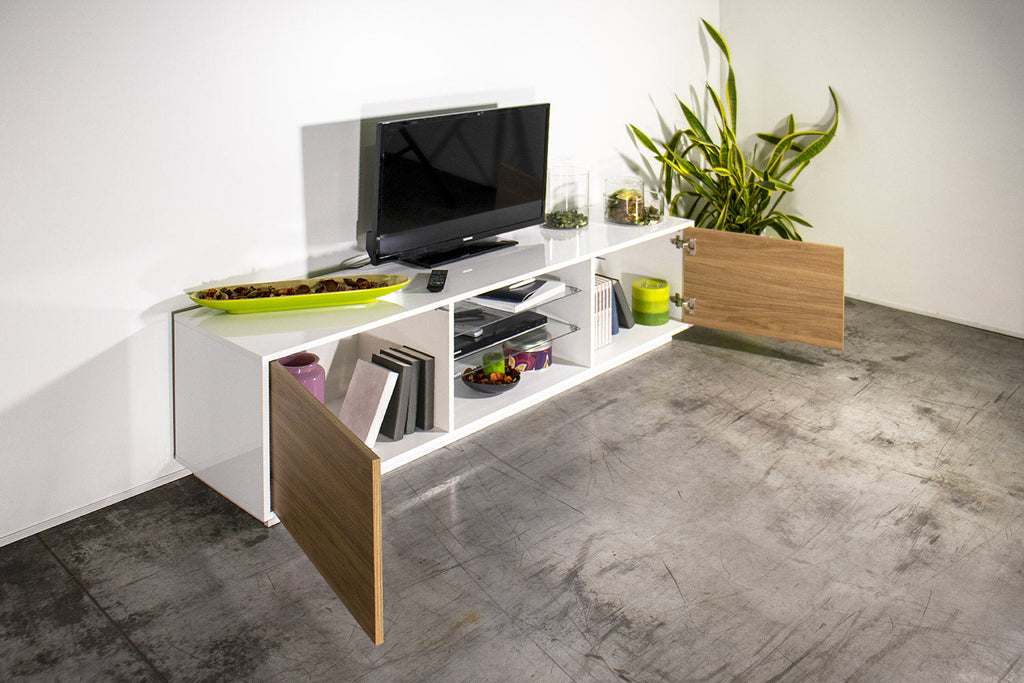 Il porta tv BLOOM da 180 cm presenta una solida struttura in di qualità ed è costituito da 3 distinte sezioni contenitive progettate in maniera funzionale all’uso quotidiano. Ai lati si trovano 2 ampi vani con anta a battente con il pratico sistema push-to-open, mentre nella sezione centrale è presente un vano giornocon 2 eleganti ripiani in vetro.