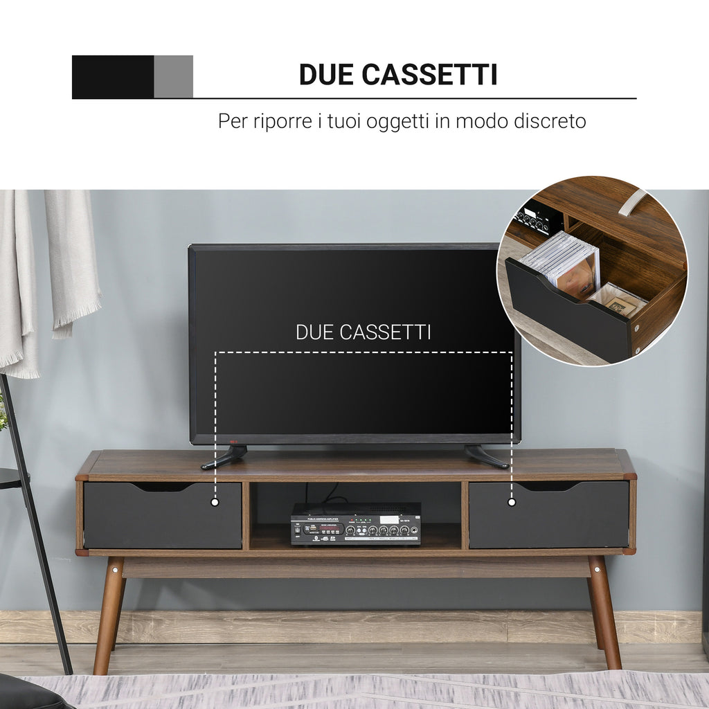 Wählen Sie den TV-Schrank, um Ihr Zuhause modischer zu gestalten! Das zentrale offene Fach und die 2 Schubladen ermöglichen Ihnen die Aufbewahrung und Ordnung Ihrer Geräte und aller Gegenstände. Es verfügt über Beine aus massivem Kiefernholz und ermöglicht Ihnen mit seiner Bodenfreiheit von 28 cm eine bequeme Reinigung des Bodens. Dieser niedrige Schrank ist der perfekte Partner, um entspannt vor dem Fernseher zu sitzen.