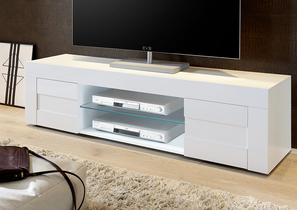 TV-Schrank mit 2 Türen und 2 Nischen mit Glasboden 181 x 42 x 44 cm in kratzfestem Melamin TFT-Build glänzend weiß