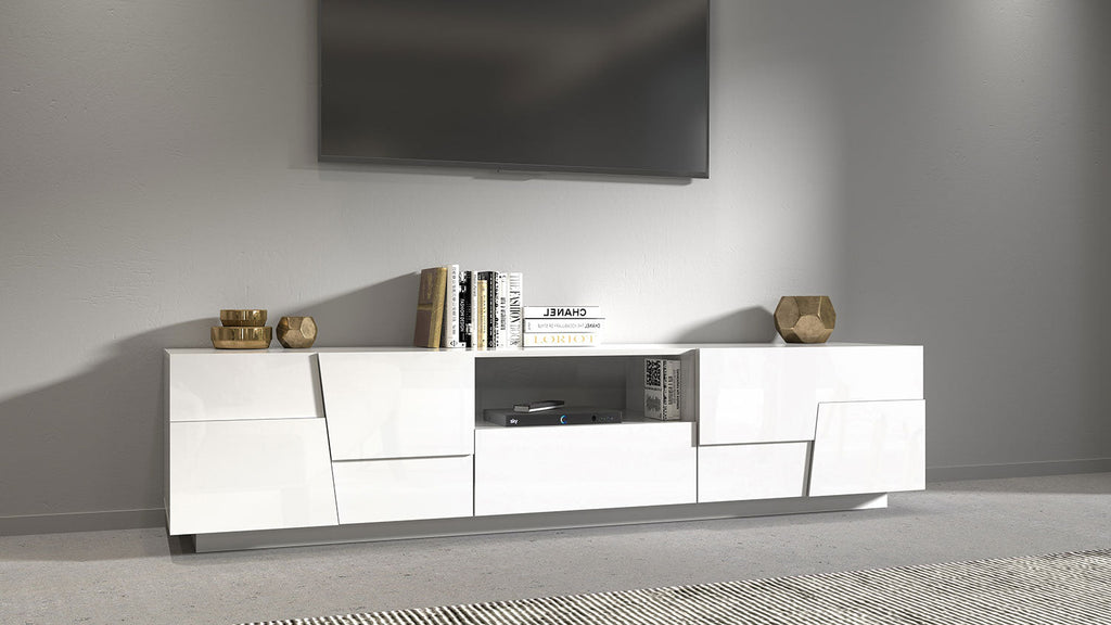 Mobile Tv 4 Anta 1 Cassetto e Ripiano a Giorno 220x44x46 cm Pongo 4A 1C Bianco Lucido