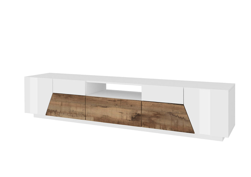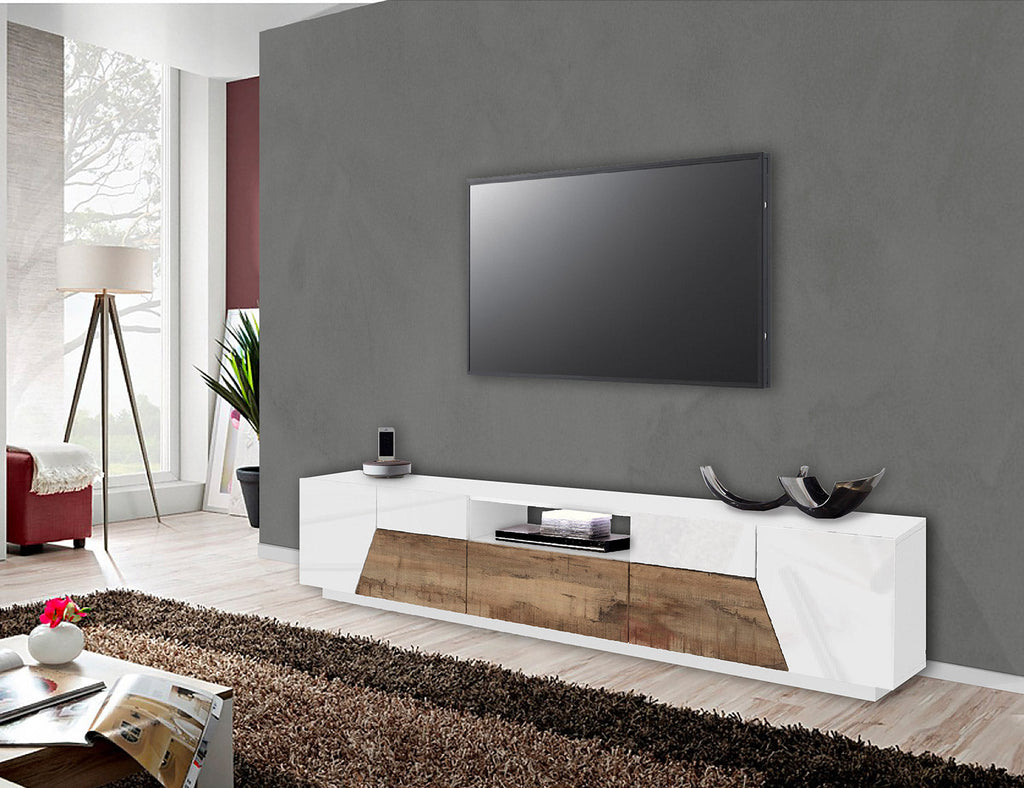 Il porta tv ALIEN da 220 cm presenta una struttura contenitiva articolata ma molto funzionale. Ai lati si trovano 2 ampi vani con 4 ante con chiusura a battente e un particolare taglio diagonale, mentre nella sezione centrale sono collocati un vano giorno e un profondo cassetto scorrevole. Il prodotto è disponibile in tinta unita o con 2 finiture a contrasto.