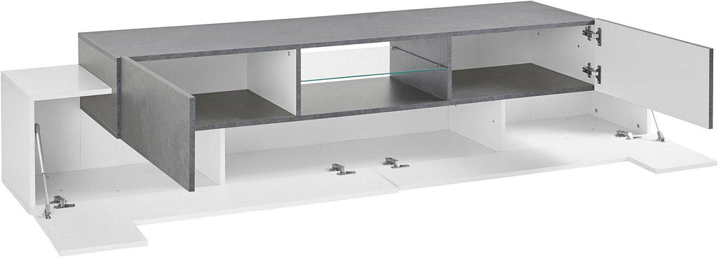 Il porta tv NEW CORO da 220 cm è costituito da 2 elementi distinti ma incastonati fra loro. L’elemento base presenta 3 ampi vani con 2 ante a L e apertura a ribalta, in cui è possibile riporre oggetti di varie dimensioni per tenere l’ambiente pulito e ordinato. L’elemento sopraelevato, invece, è più piccolo e presenta 2 vani laterali con anta a battente e un vano centrale a giorno con mensola in vetro, in cui riporre gli accessori tecnologici a servizio della tv. Il vano giorno può essere dotato di illuminazione a LED bianco o blu.