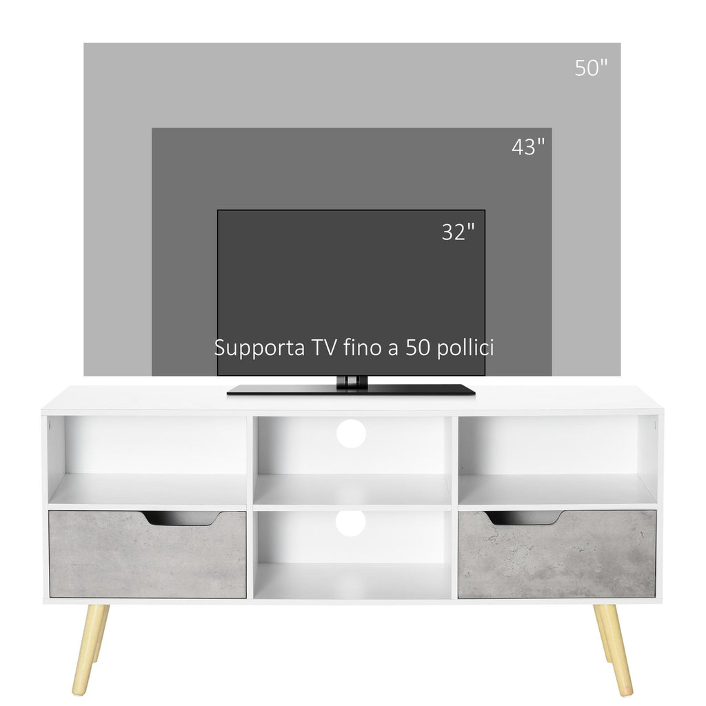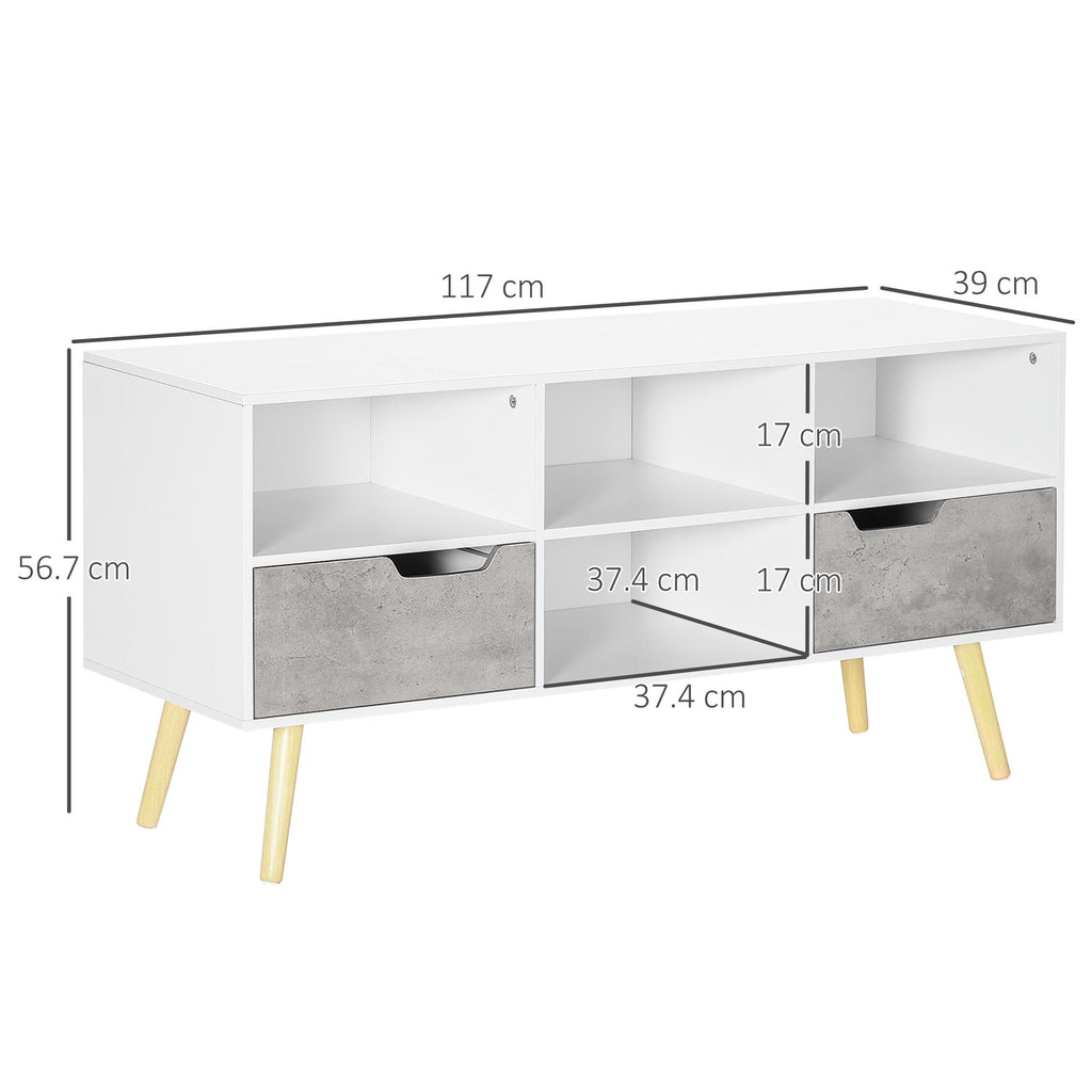 TV-Schrank 4 Fächer 2 Schubladen 117 x 39 x 56,7 cm für Fernseher bis 50" in weißer und hellgrauer Spanplatte