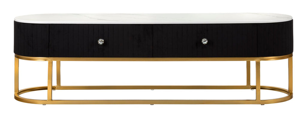 Il mobile porta TV con lati smussati e cassetto è un elegante complemento d'arredo che può abbinarsi a qualsiasi stile di arredamento. La struttura in metallo dorato conferisce un tocco di raffinatezza, mentre la parte superiore rivestita in tessuto imbottito nero aggiunge un elemento di comfort. Il piano realizzato in simil marmo crea un gradevole contrasto che dona ulteriore eleganza alla composizione. Questo mobile è ideale per organizzare e conservare gli apparecchi elettronici, garantendo al contempo un tocco di stile al tuo spazio living.