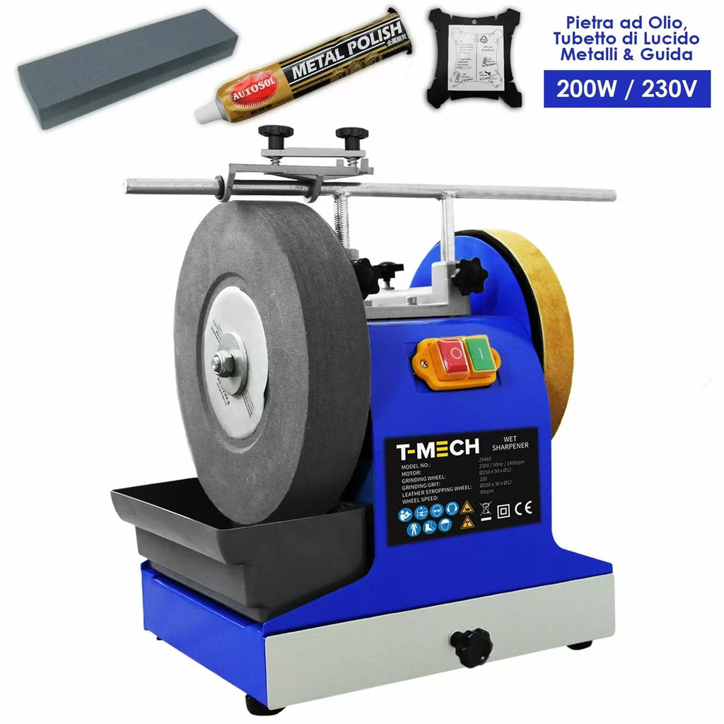 Macchina con ruota abrasiva e sistema di raffreddamento ad acqua per affilare i tuoi attrezzi. La robusta mola e l’affilatore manuale GRATIS ti permettono di affilare e raffinare ogni lama alla perfezione. Usa la coramella di pelle per una finitura perfetta, lustra i tuoi arnesi usando il gratuito tubetto con lucido per metalli.