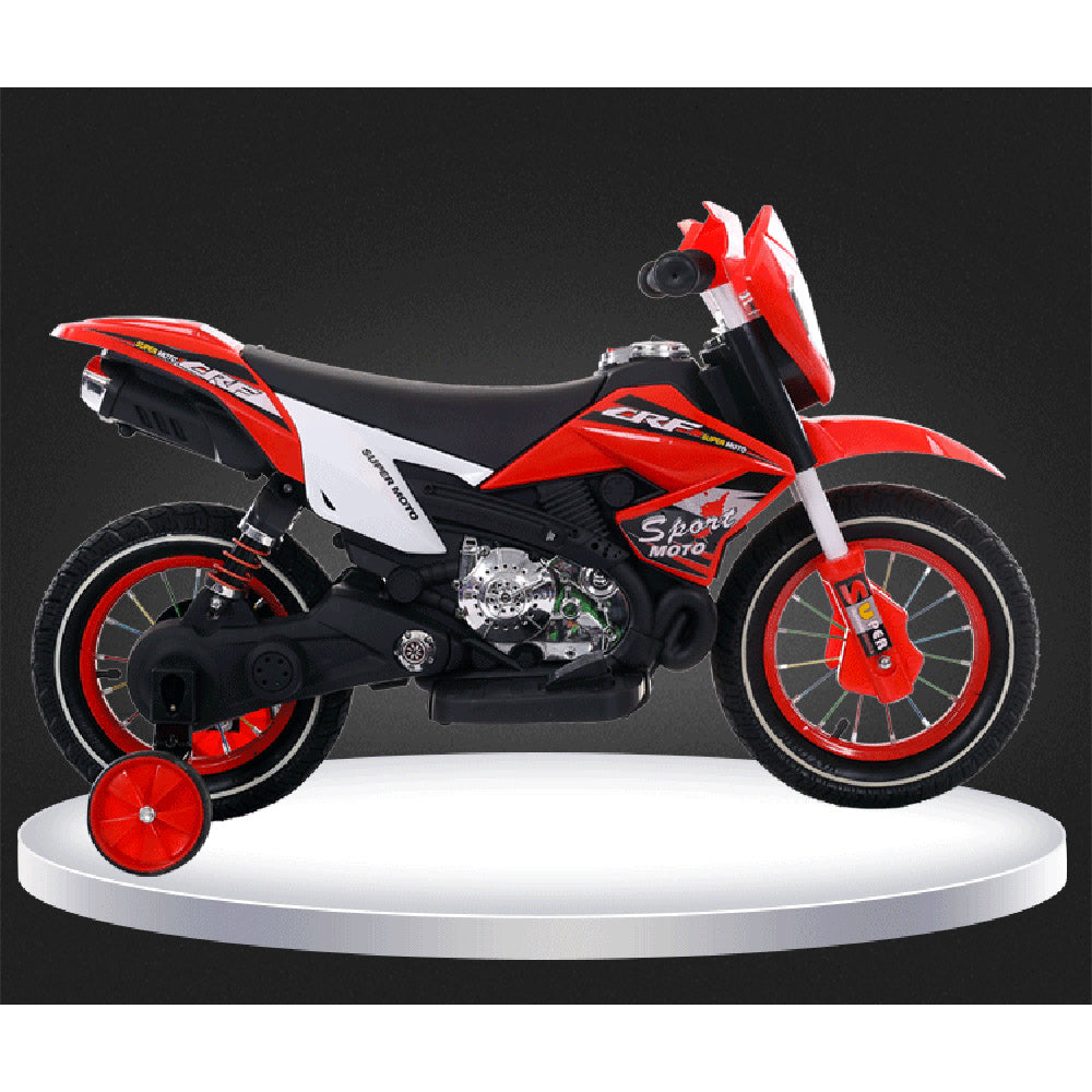 Das Elektromotorrad Motocross 6V für Kinder ist eine Reproduktion des Motocross-Supermotos. Es ist mit Stützrädern für maximale Stabilität ausgestattet. Ihre Kinder werden sich im Sattel dieses elektrischen Motocross-Fahrrads freuen, sich wie Erwachsene auf 2 Rädern bewegen zu können, was auch durch die realistische Wiedergabe von Lichtern und Geräuschen unterstützt wird. Es ist ideal, um unvergessliche Gaming-Momente zu verschenken.