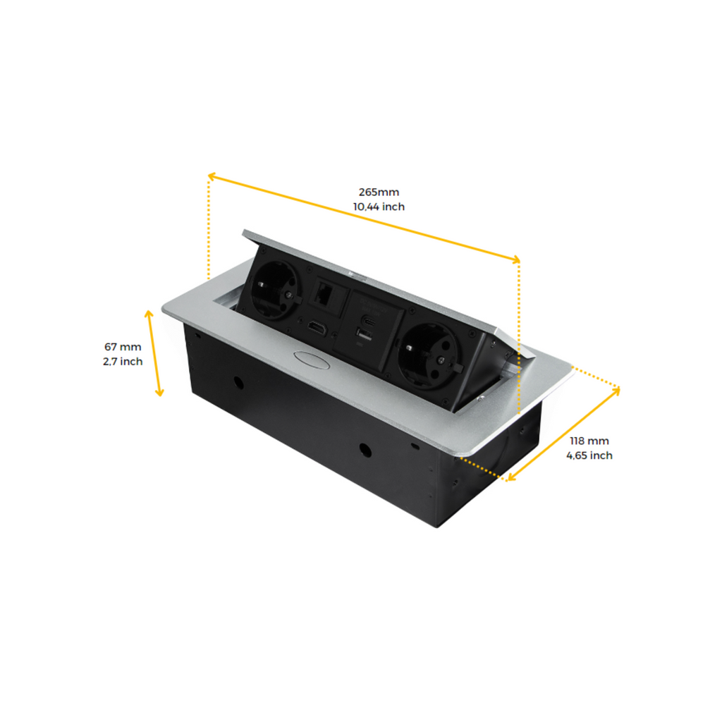 A seconda del modello scelto, dispone didue prese Schuko di tipo F (UE) con una potenza massima consentita fino a 3.000 W - 13 A due connettori USB per caricare dispositivi elettronici 5V DC (1 x 2A / 2 x 1,5A), un ingresso per la rete RJ45 E5 non schermato e un connettore HDMI 2.0.
