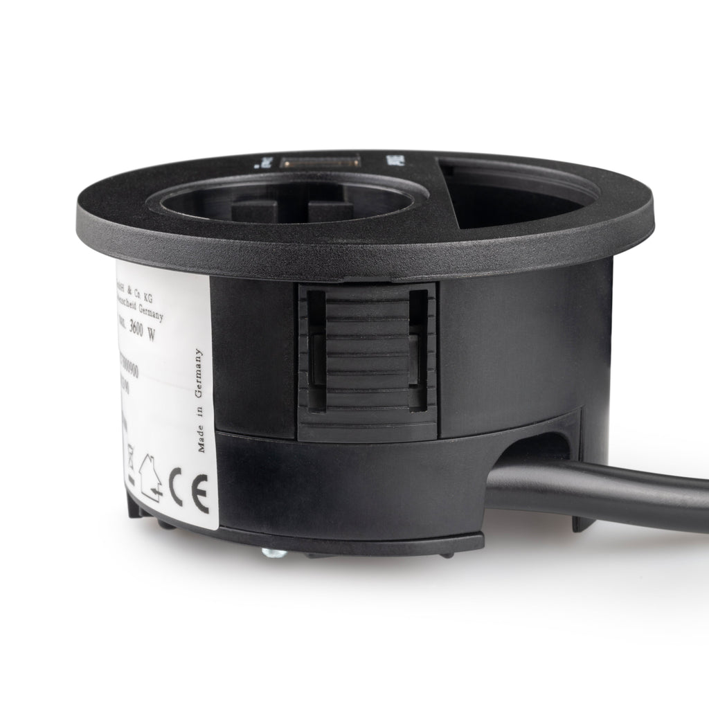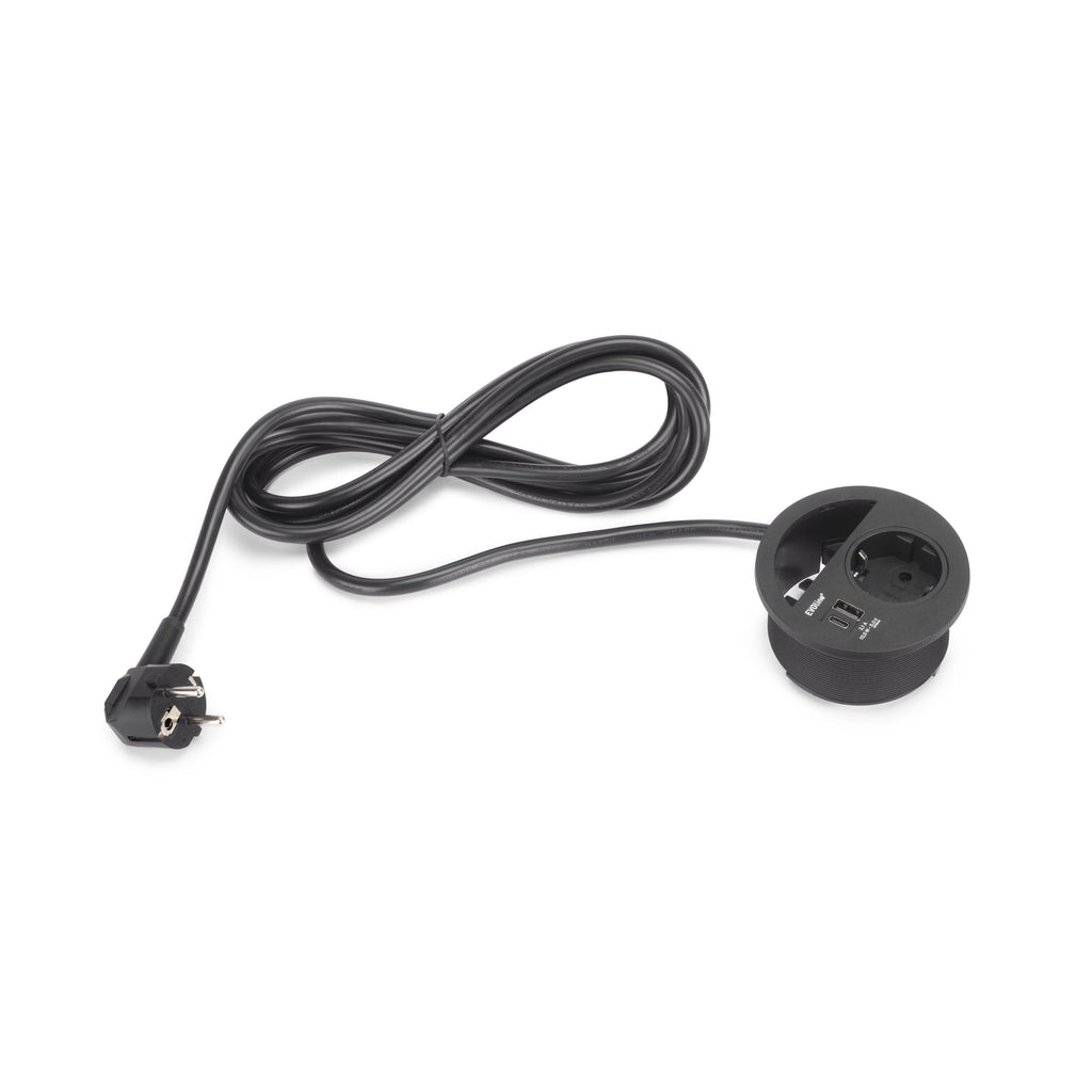 Presa multipla con passacavo ideale per mobili da ufficio e per la casa. È progettato per permetterti di avere sempre una presa di corrente, due connettori USB e tutti i cavi di cui hai bisogno a portata di mano.