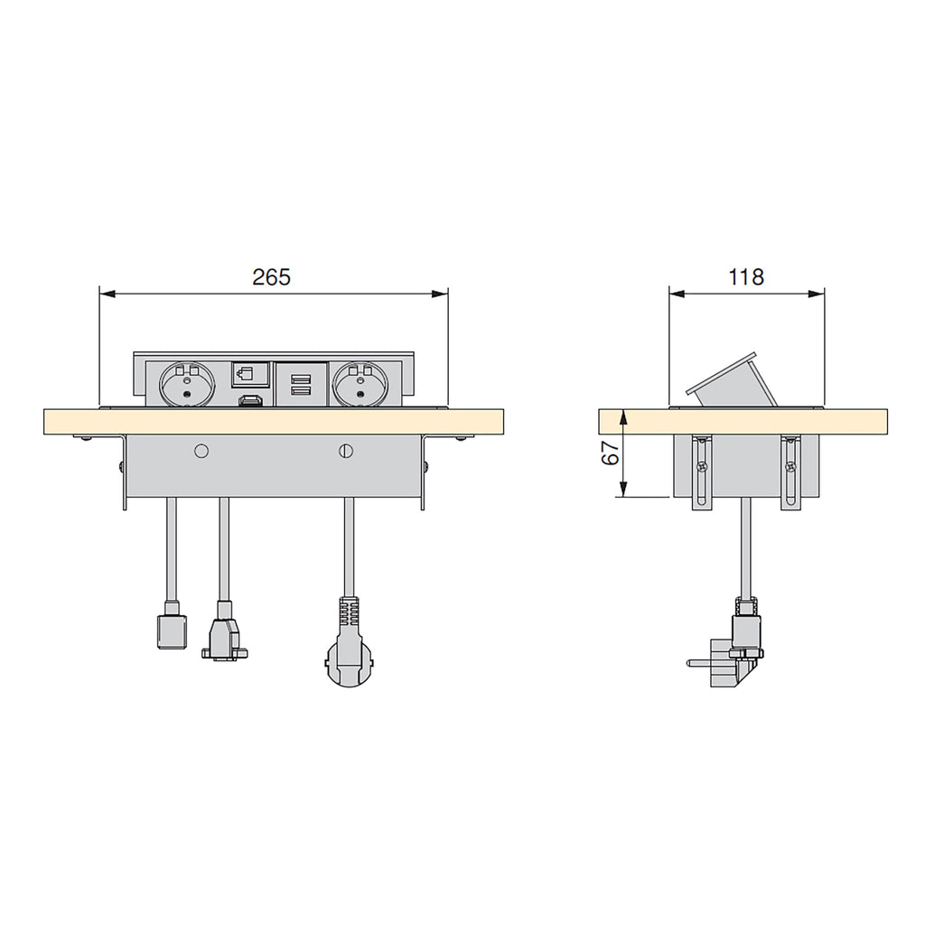 Die Installation ist sehr vielseitig, da sie Verbindungskabel zum werkzeuglosen Anschluss der Peripheriegeräte sowie ein 1,5 m langes Kabel mit Stecker für den Betrieb bei 250 V AC 50 Hz umfasst. Dies erfordert eine maschinelle Bearbeitung der Platte und ermöglicht die Montage auf Oberflächen mit großer Dicke, höchstens 36 mm. Die Befestigung am Möbel erfolgt mit den im Lieferumfang enthaltenen Halterungen und Schrauben.