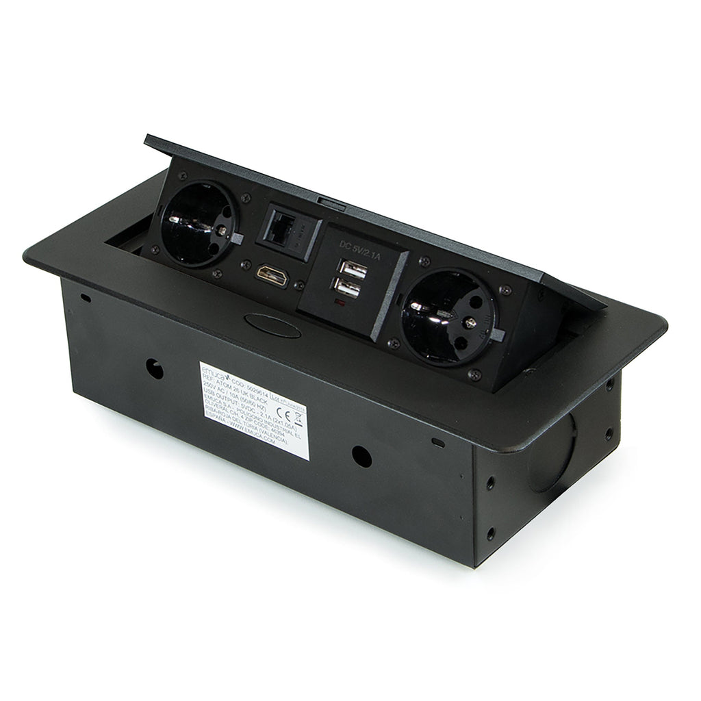 Je nach gewähltem Modell verfügt es über einen oder zwei Schuko-Stecker vom Typ F (EU) oder G (UK) mit einer maximalen Leistung von bis zu 3.000 W - 13 A, zwei USB-Anschlüsse zum Aufladen elektronischer Geräte mit 5 V DC (1 x 2 A / 2 x 1,5 A), einen RJ45-Netzwerkanschluss und einen HDMI2.0-Anschluss . Es enthält eine Abdeckung , die einen einfachen Zugang zu den Anschlüssen und eine diskrete LED-Betriebsanzeige ermöglicht.