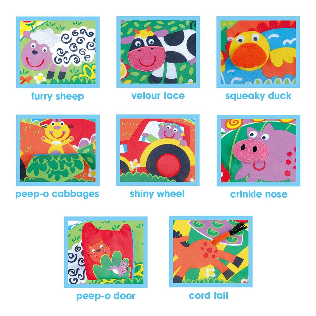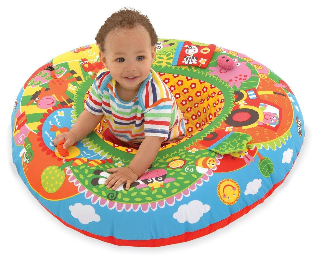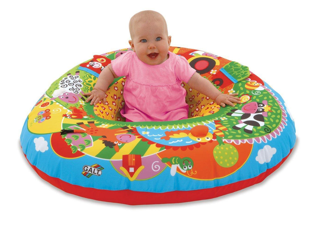 Aufblasbarer Ring mit Stoffbezug und 8 multisensorischen Aktivitäten am Rand. Maschinenwaschbarer Bezug.