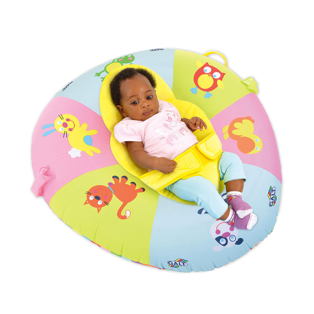 Eine neue Version des Nestes, von beiden Seiten nutzbar. Auf der einen Seite empfängt ein mit einem Gurt versehener weicher Bereich das Baby in den ersten Monaten: Am Bogen können 3 farbige Spielzeuge eingehakt werden. Auf der anderen Seite kann das Kind sitzen und mit den 8 multisensorischen Aktivitäten am Rand spielen. Der Bezug ist maschinenwaschbar. Der Bogen wird mit Wasser gereinigt.