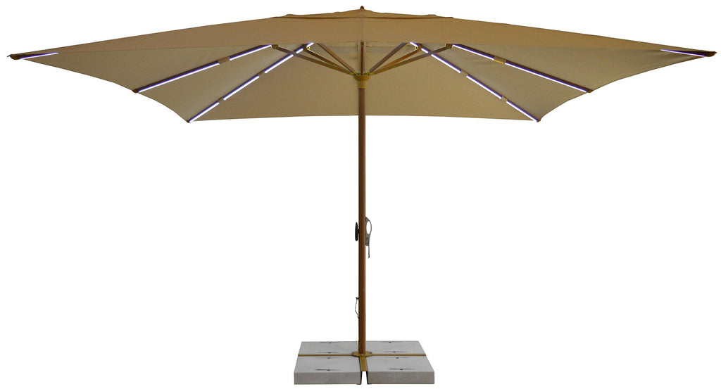 Sonnenschirm für Freiflächen mit automatischer Teleskopöffnung. Einfaches Schließen mit ergonomischem Griff und Aurora LED-Lichtsystem. Fester Sockel im Lieferumfang enthalten.