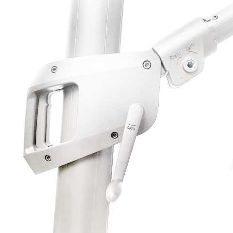 Ombrellone in alluminio color silver con copertura in tessuto axroma impermeabile grigio. Struttura con verniciatura a polvere, funzione di inclinazione, ghiera laterale regolabile e basculante laterale. Dotato di base a rotazione a 360° e base a croce, escluse le pianelle di fissaggio. Inclusa cover per proteggerlo quando non in uso.