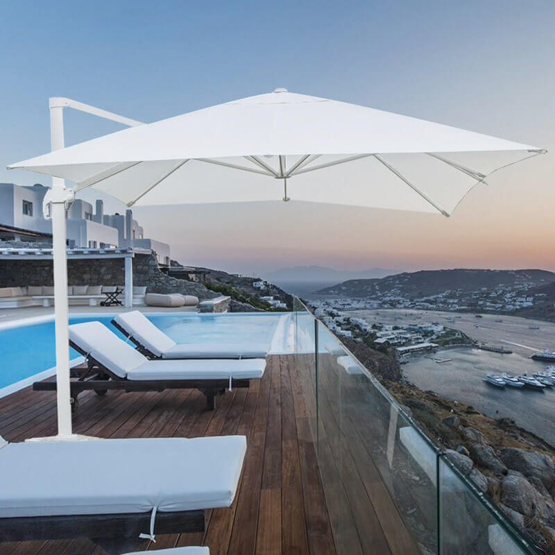 Dezentraler Gartenschirm 3x3m aus Aluminium mit Mosini Blues White Polyestergewebe