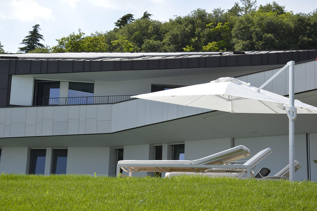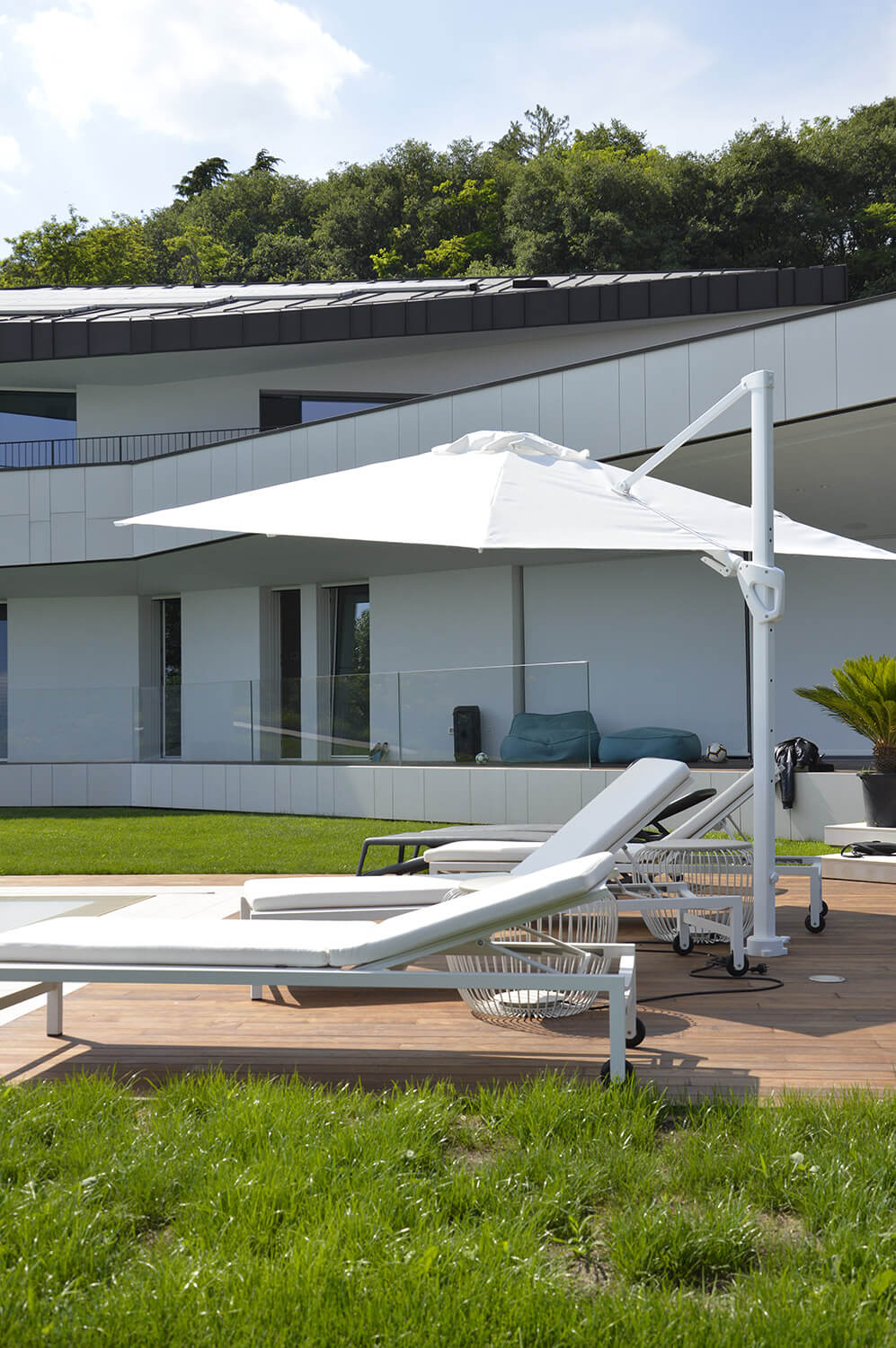 JAZZ, der auch seitlich neigbare Aluminiumschirm für den Außenbereich aus Aluminium mit seitlicher Armstruktur und Polyestergewebe.