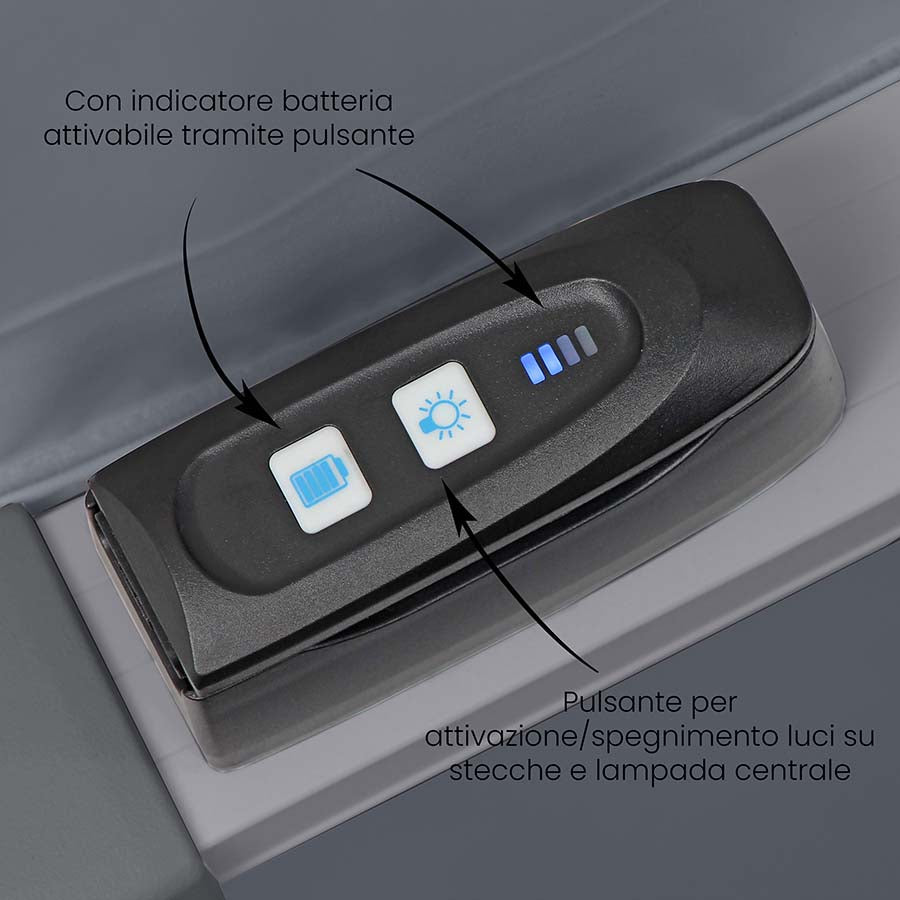 Per quanto riguarda l'illuminazione, tramite la comoda batteria rimovibile presente sulla struttura potrai verificare in qualsiasi momento lo stato della batteria e modificare l'illuminazione desiderata: nessuna, solo centrale, solo stecche, centrale e stecche