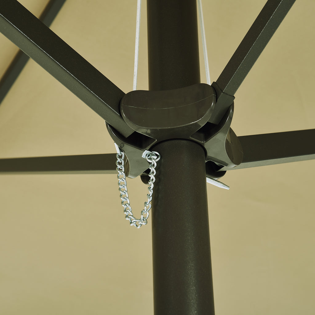 Genießen Sie sonnige Tage mit diesem großen Sonnenschirm. Der Rahmen besteht aus pulverbeschichtetem Metall und der Baldachin aus Polyester: ein wasserdichtes Material, das UV-Strahlen filtern kann. Öffnen Sie den Sonnenschirm mit der passenden Kurbel und entspannen Sie sich im Schatten: Einmal geöffnet kann er eine Fläche von 4,6 m abdecken.