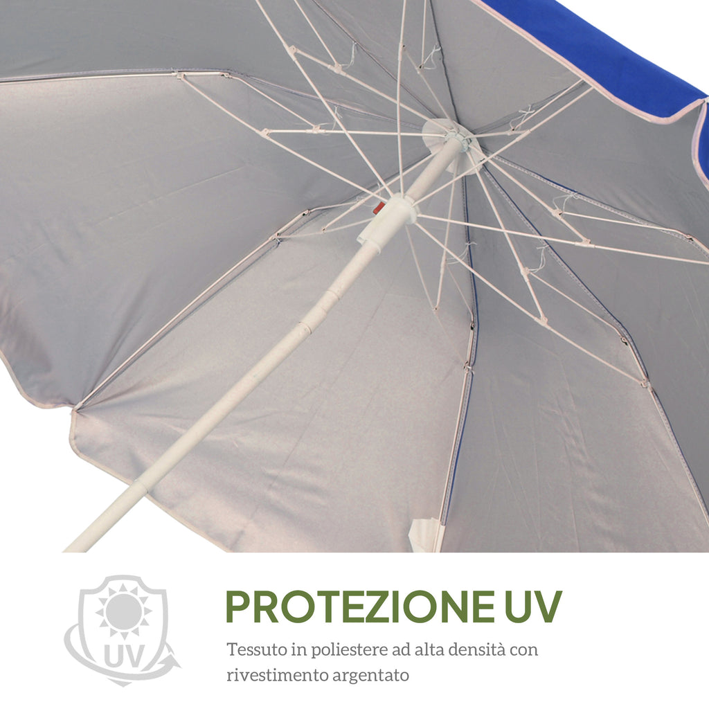 Goditi le tue giornate al mare durante la bella stagione con il nostro ombrellone da spiaggia inclinabile. La sua struttura in metallo verniciato a polvere garantisce solidità e stabilità tutto il giorno, mentre la fodera argento riflette il calore e offre ampia protezione solare per adattarsi alle tue esigenze durante la giornata. Le 8 robuste stecche metalliche rafforzano ulteriormente la struttura, assicurando durata e resistenza.