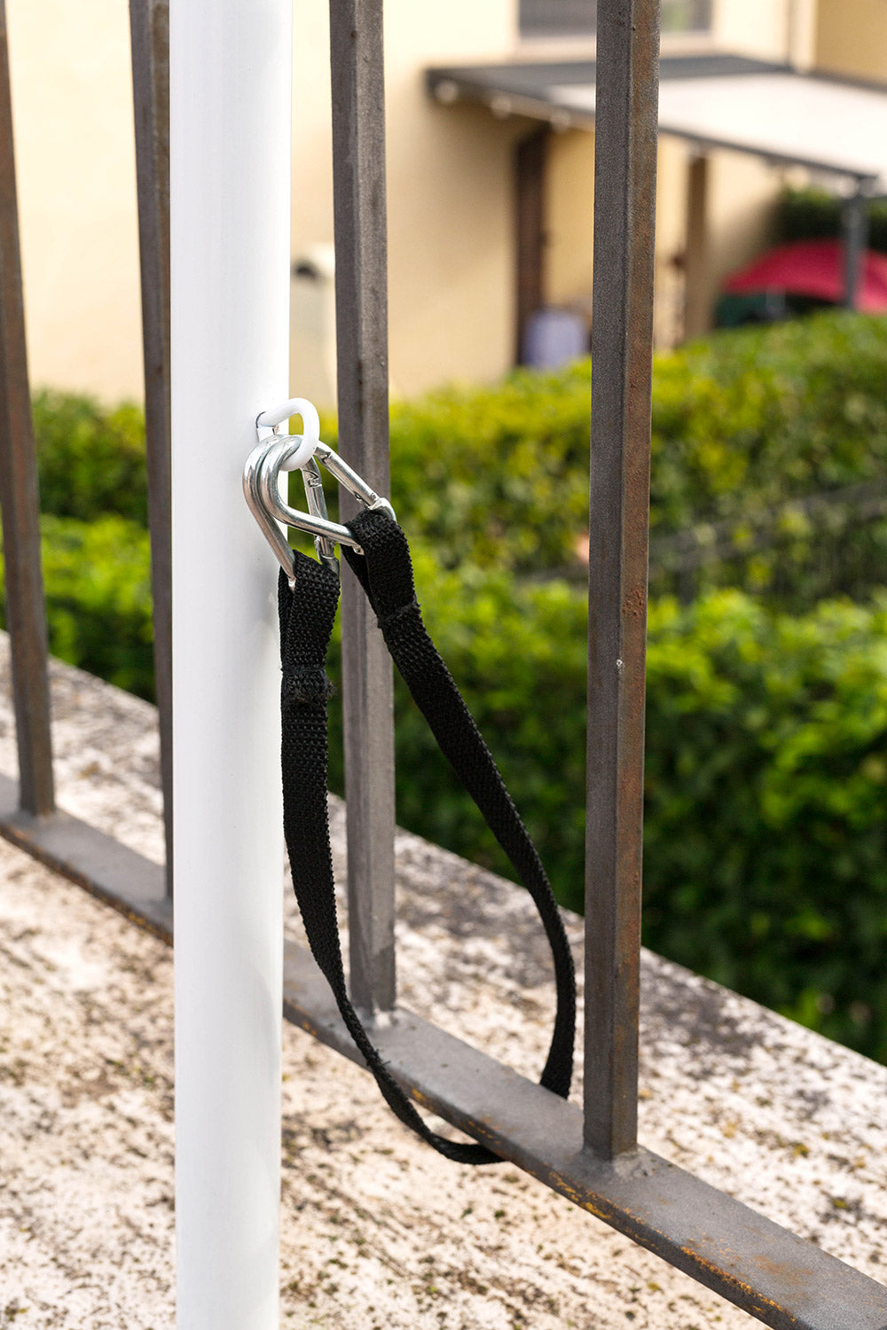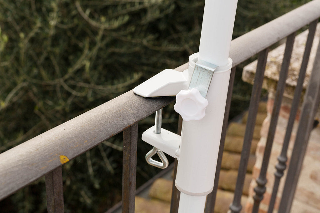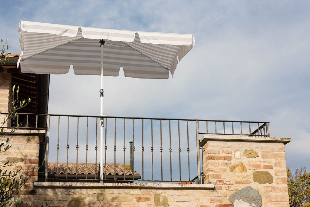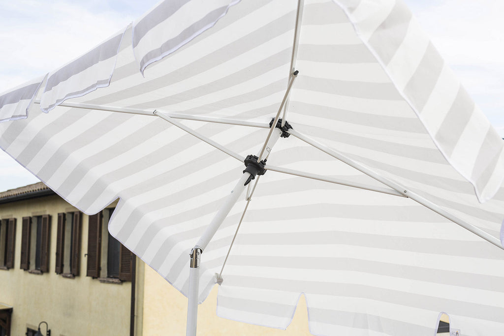 Der rechteckige Flexo-Regenschirm mit Aluminiumstruktur und 25-kg-Basis eignet sich für vielfältige Anwendungen und häusliche Situationen. Es kann in der Höhe verstellt, an beiden Längsseiten geneigt und am Geländer verankert werden. Es ist auch mit einem Sicherheitssystem zum Einhängen an einem Geländer oder einer Wand ausgestattet, das es Ihnen ermöglicht, auch in hohen Stockwerken vor Windböen zu installieren, ohne das Risiko einer Beschädigung einzugehen. Dank einer mit Wasser oder Sand befüllbaren Basis aus recyceltem Kunststoff auch auf Balkon und Garten einsetzbar, im Winter durch einfaches Entleeren sehr einfach zu verstauen.