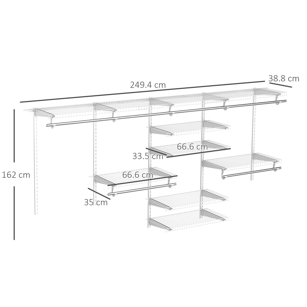 Organizer in Acciaio da Parete 249,4x38,8x162 cm 9 Ripiani Regolabili e 5 Aste per Appendere in Acciaio Bianco