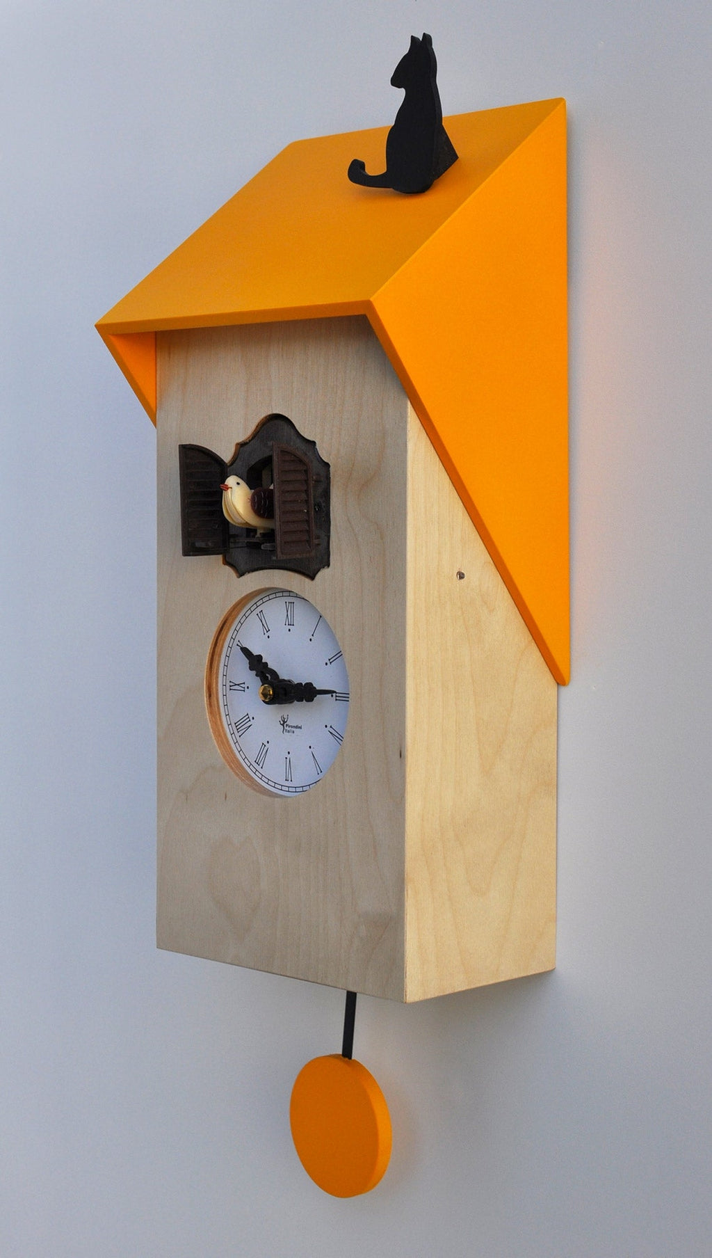 Wandkuckucksuhr 17x37x12 cm Pirondini Italia Vicenza mit natürlicher und gelber Katze.