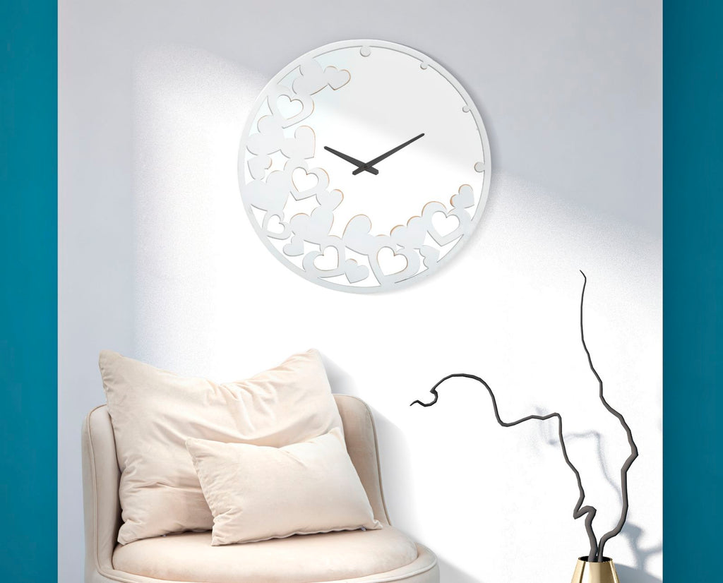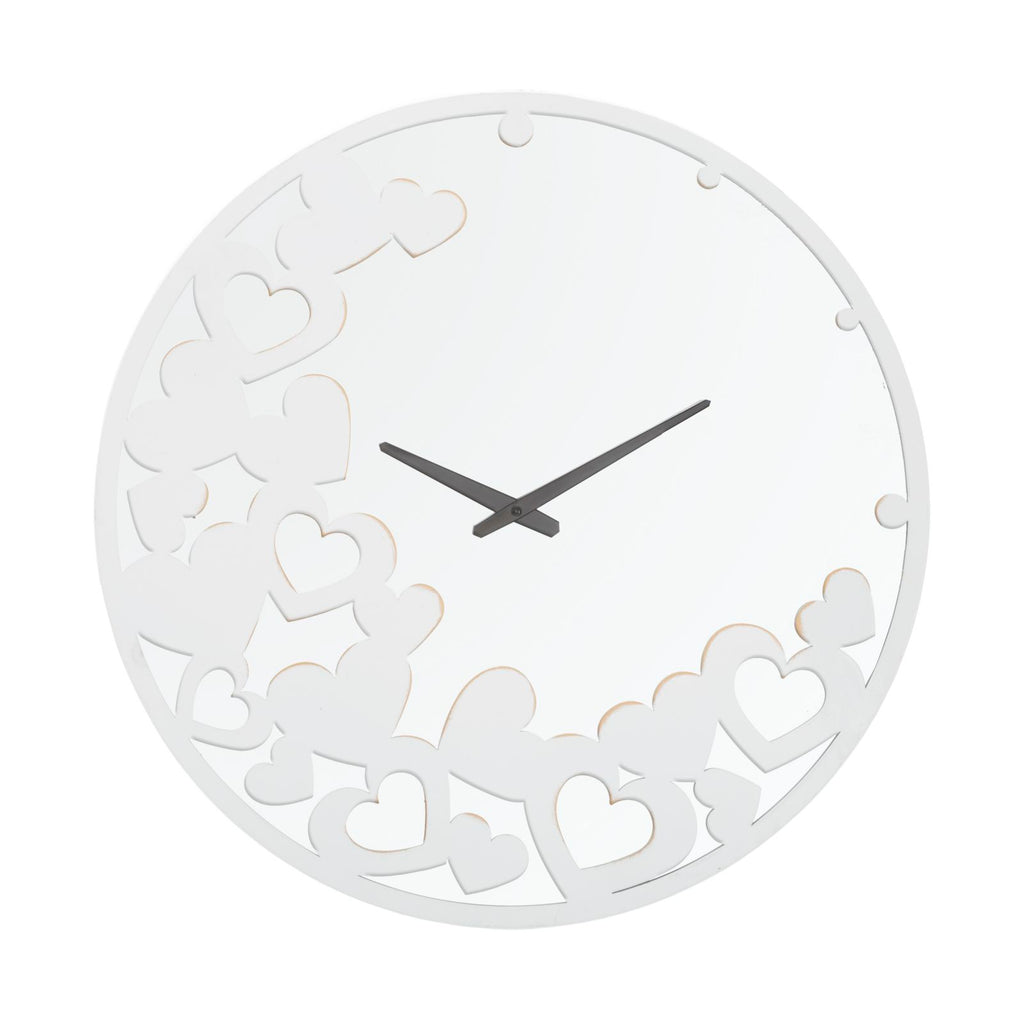 Wanduhr aus weißem Metall und Spiegel mit elegant geschnitzten Herzen, die jeder Umgebung einen Hauch von Schlichtheit und Klasse verleihen.