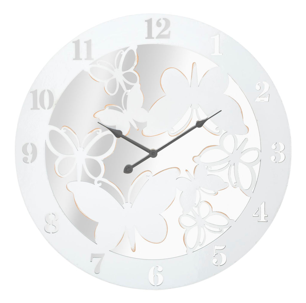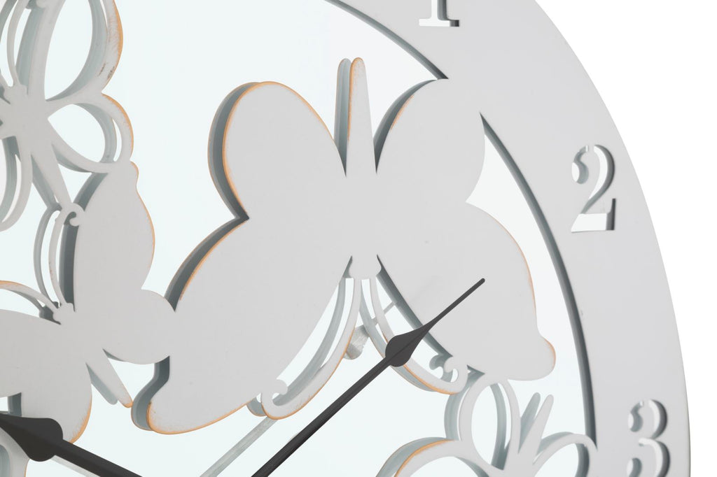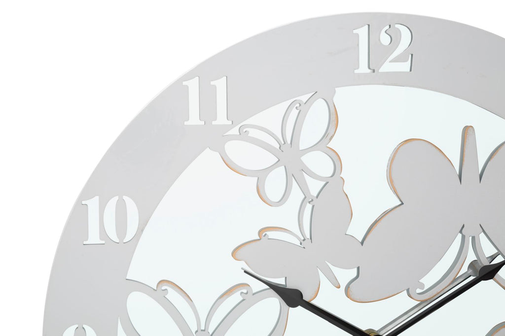 Elegante runde Wanduhr aus weißem Metall und Spiegel. Das Design mit fliegenden Schmetterlingen erinnert an die Natur und verleiht jeder Umgebung einen Hauch von Klasse.