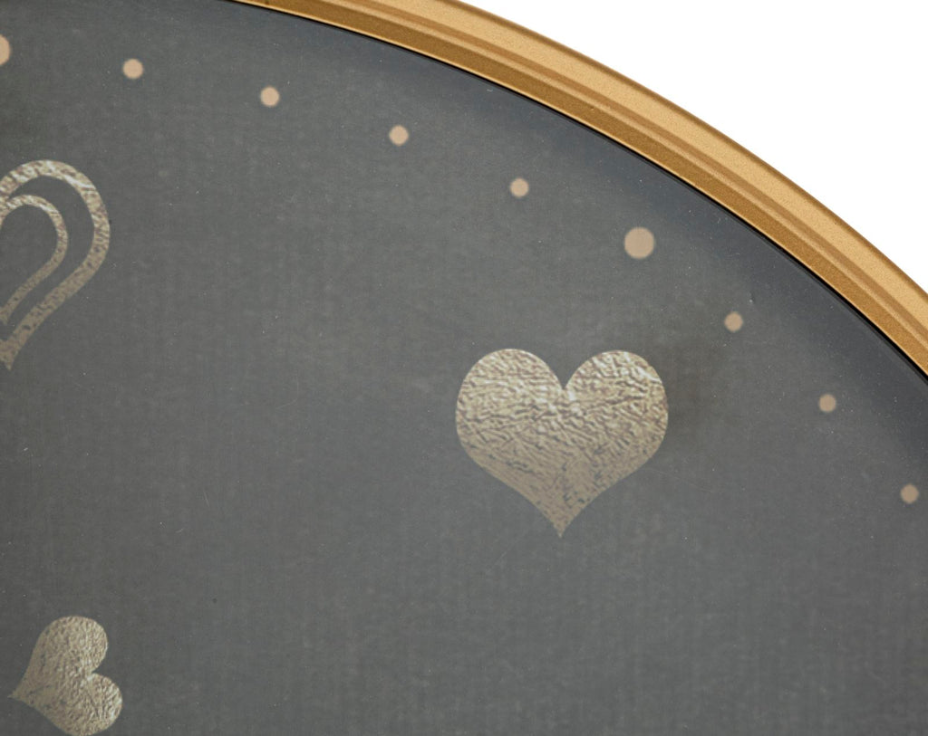 Wanduhr aus MDF, Metall und Glas mit geometrischen Linien, verziert mit eleganten Herzverzierungen. Edle Blitze charakterisieren Wanduhren, die jedem Möbel einen Hauch von Opulenz verleihen.