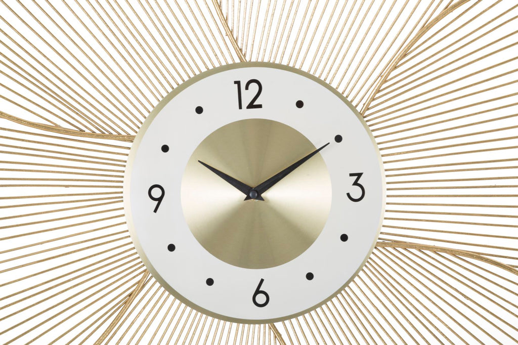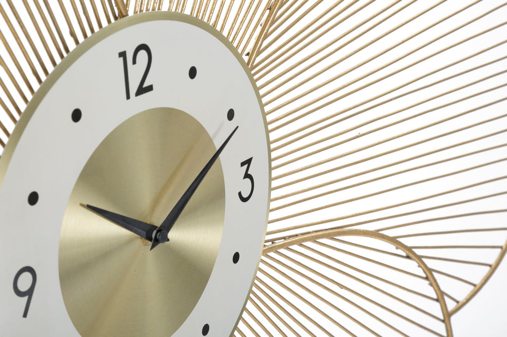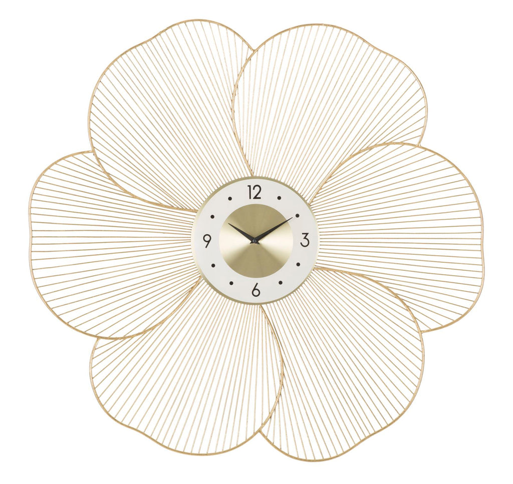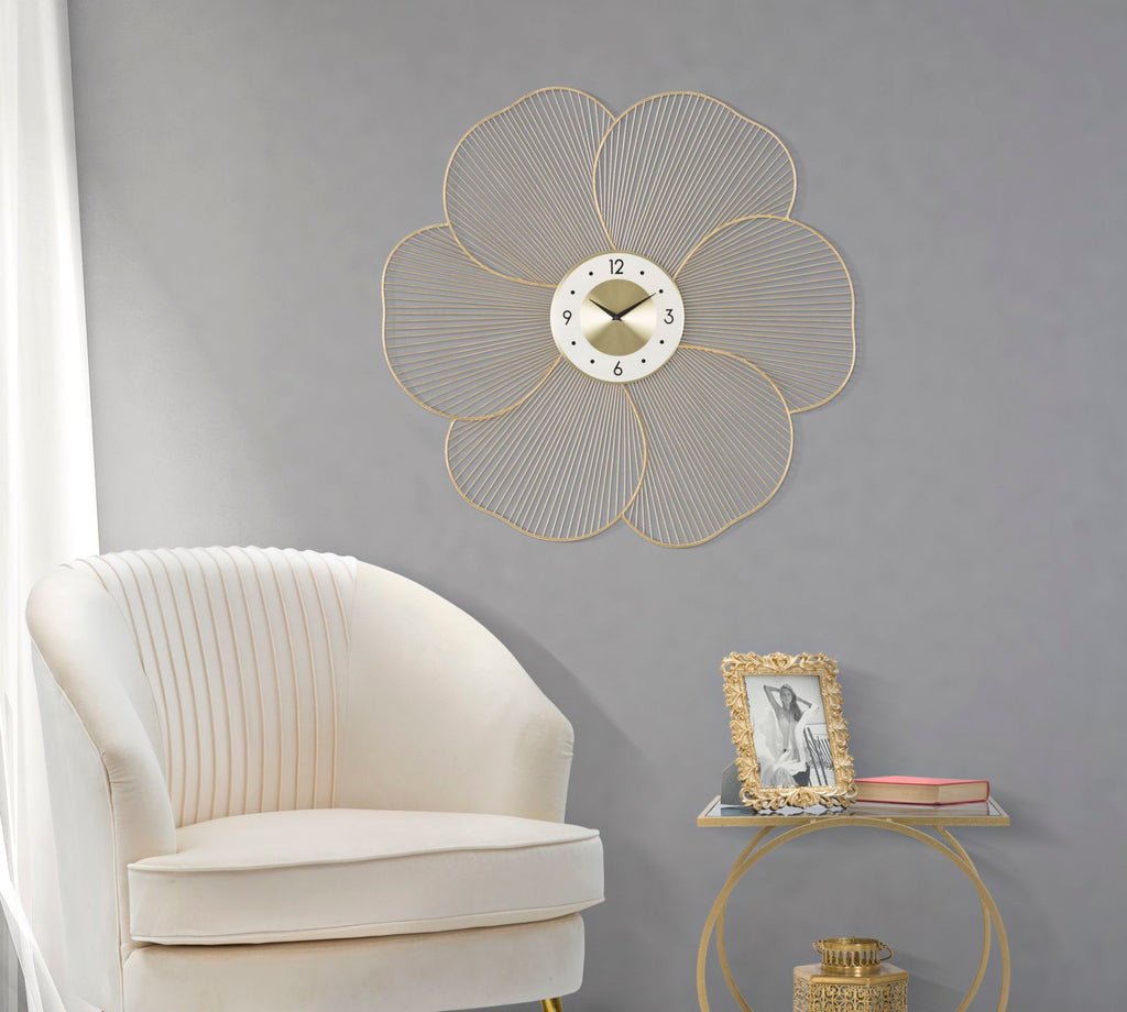 Elegante Wanduhr aus goldenem Metall in Form einer Blume, die einen Hauch von Klasse verleiht, die sich auf die Natur bezieht.
