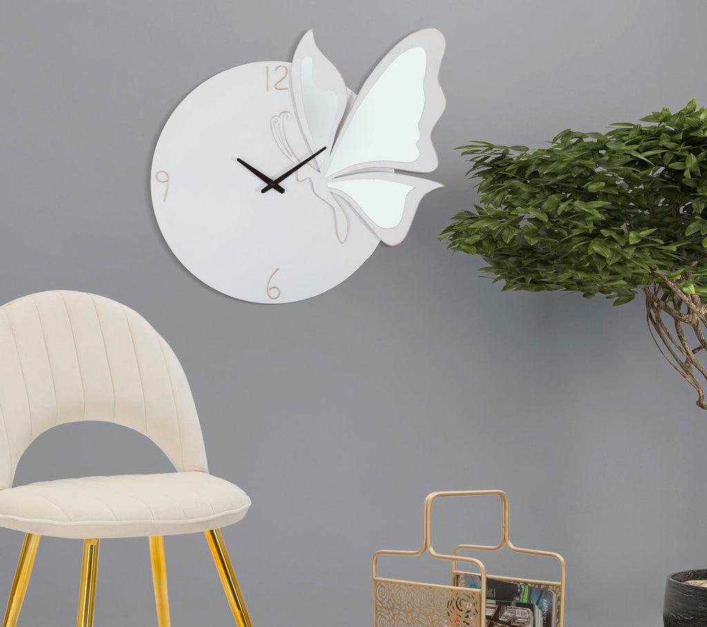 Wanduhr aus weißem Metall und Spiegel mit einem eleganten Schmetterling im Flug, der jeder Umgebung einen Hauch von Schlichtheit und Klasse verleiht.