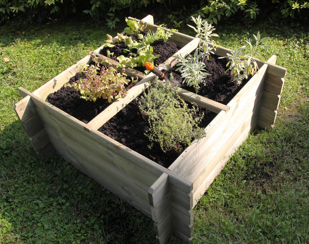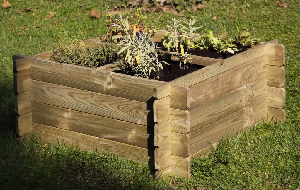 Gemüsegarten aus Nadelholz im Autoklaven imprägniert, Wandstärke 1,8 cm, Lieferung im Bausatz inklusive Trennwänden und Befestigungsmaterial. Es hat keinen Boden.