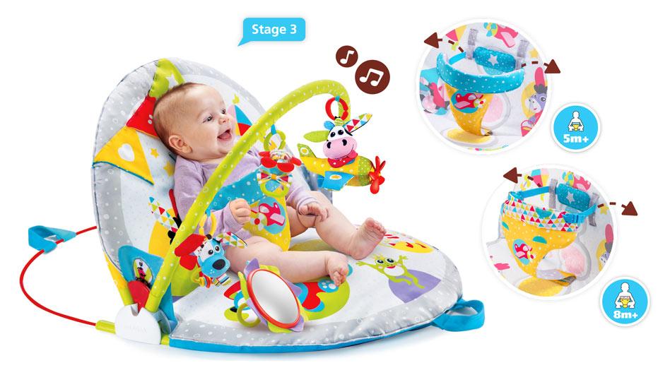 - Ein dreistufiges, gepolstertes Fitnessstudio, das sich leicht in einen unterstützenden Sitz zum Sitzen und Spielen verwandeln lässt.