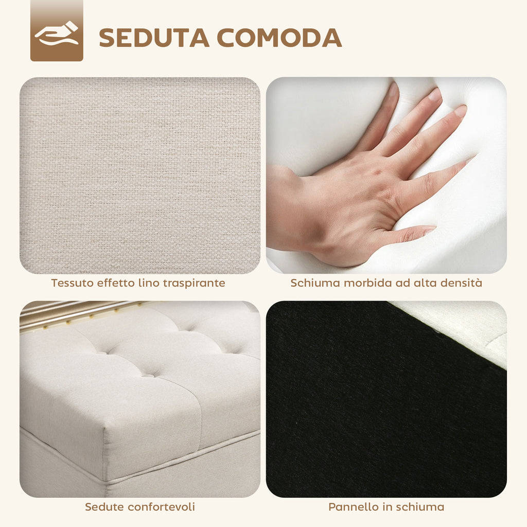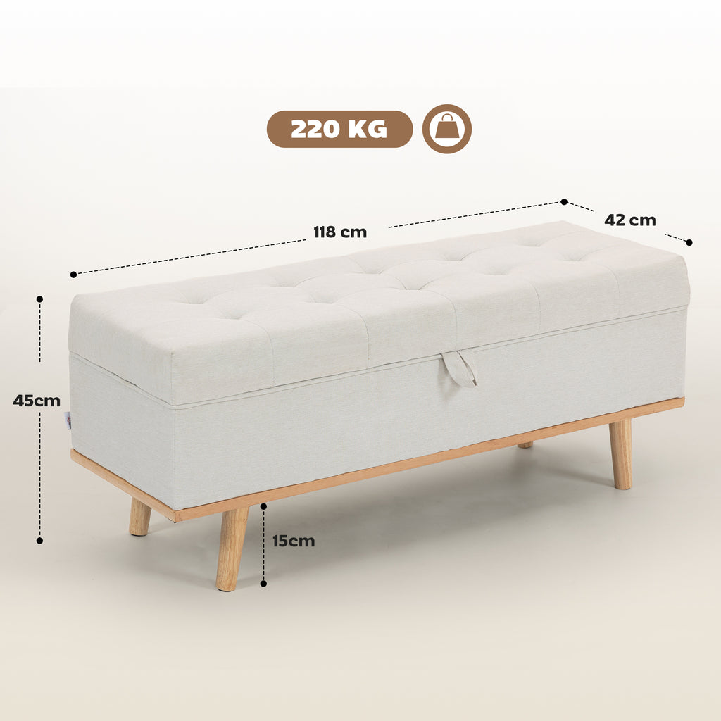 Panca Contenitore 118x42x45 cm da 80L Imbottita con Rivestimento in Tessuto e Gambe in Legno Crema