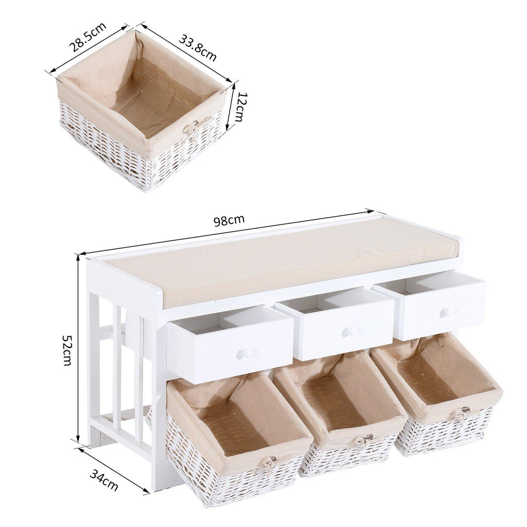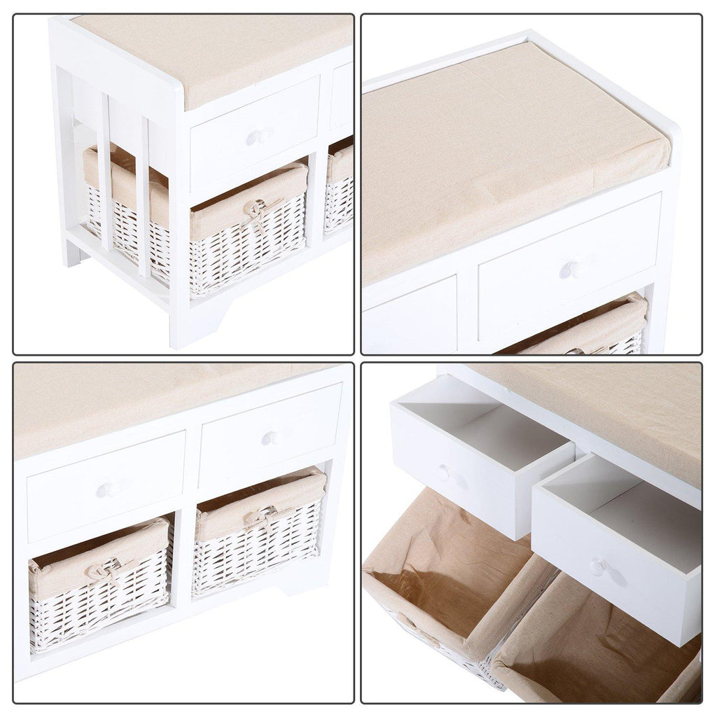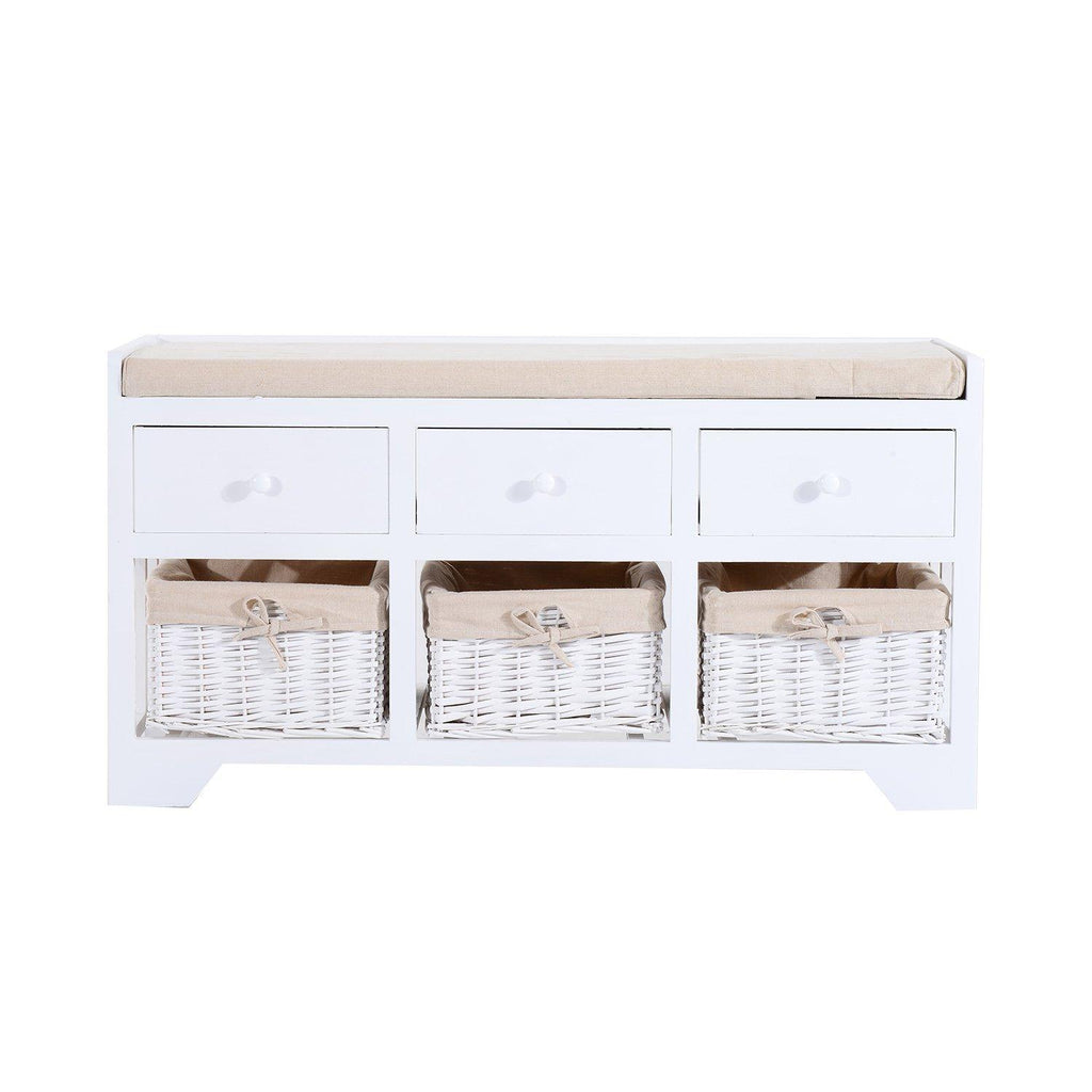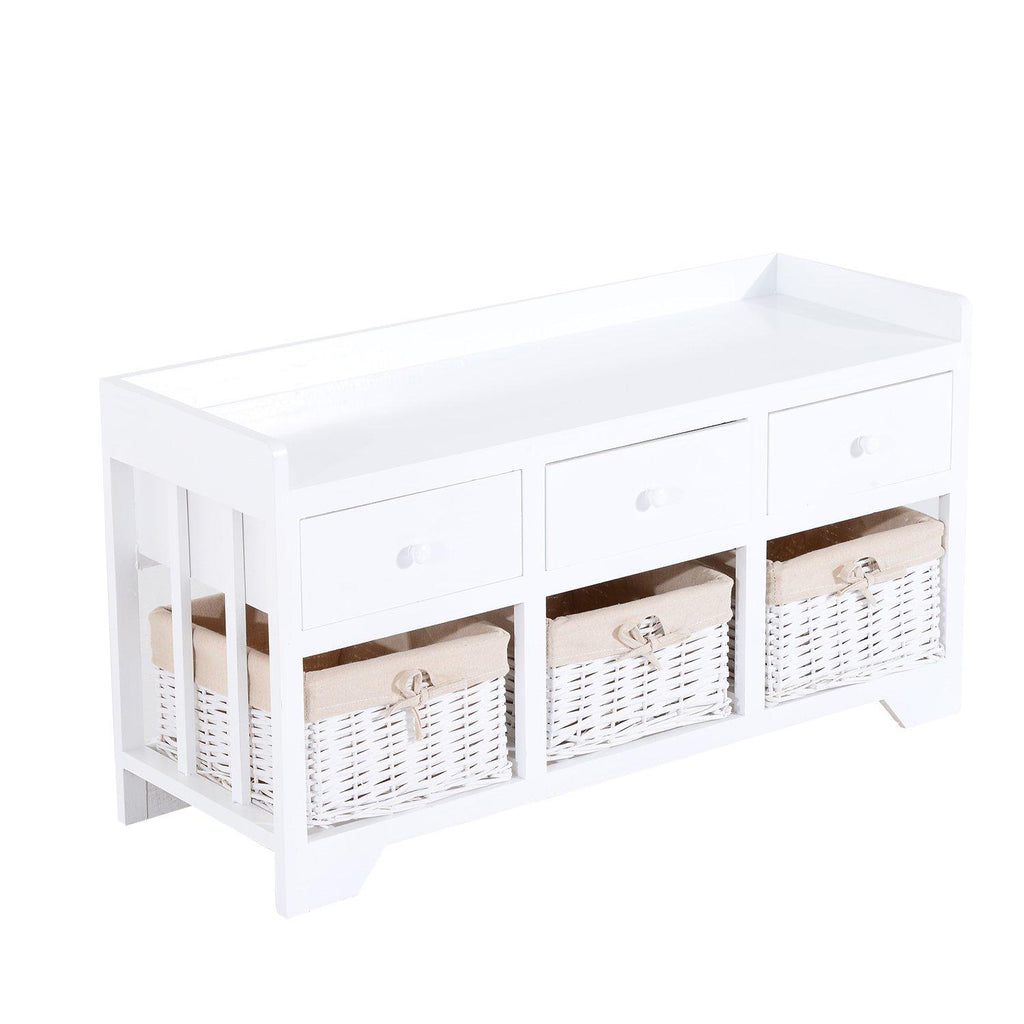 Holzbank mit Schubladen und weißen Weidenkörben 98 x 34 x 52 cm