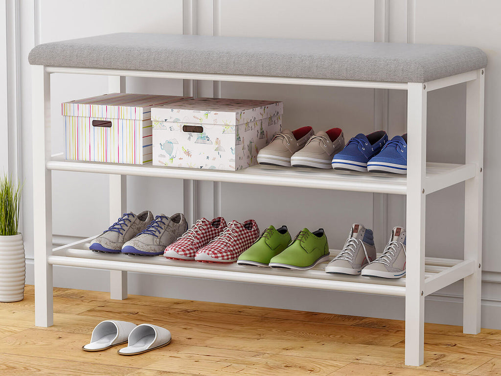Eingangsbank Schuhregal 80 x 30 x 50 cm aus Metall und weißem/grauem Domus-Stoff