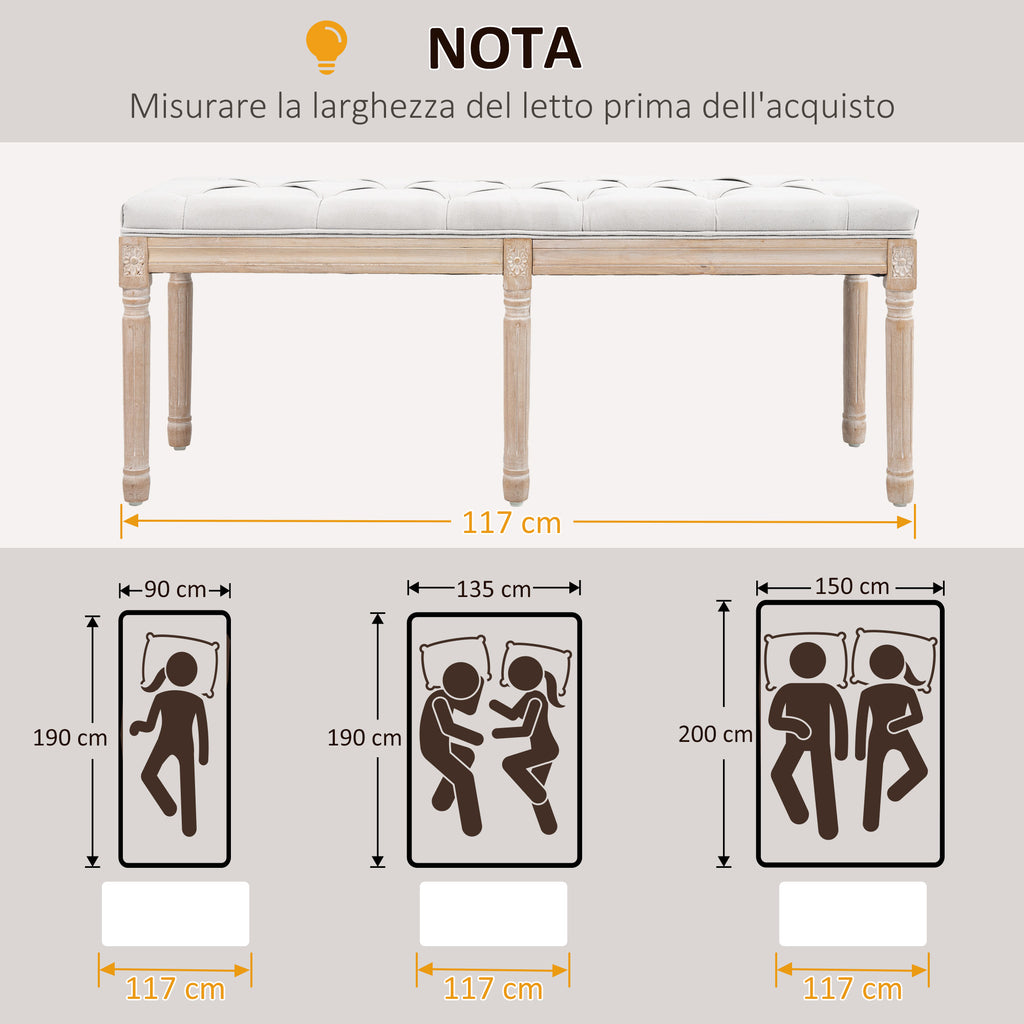 Panca Fondo Letto Imbottita Stile Vintage 117x40x48 cm in Tessuto e Gambe in Legno Crema