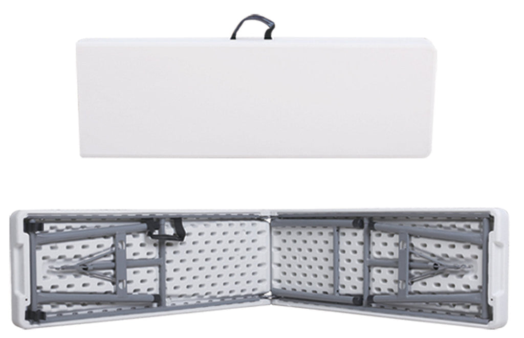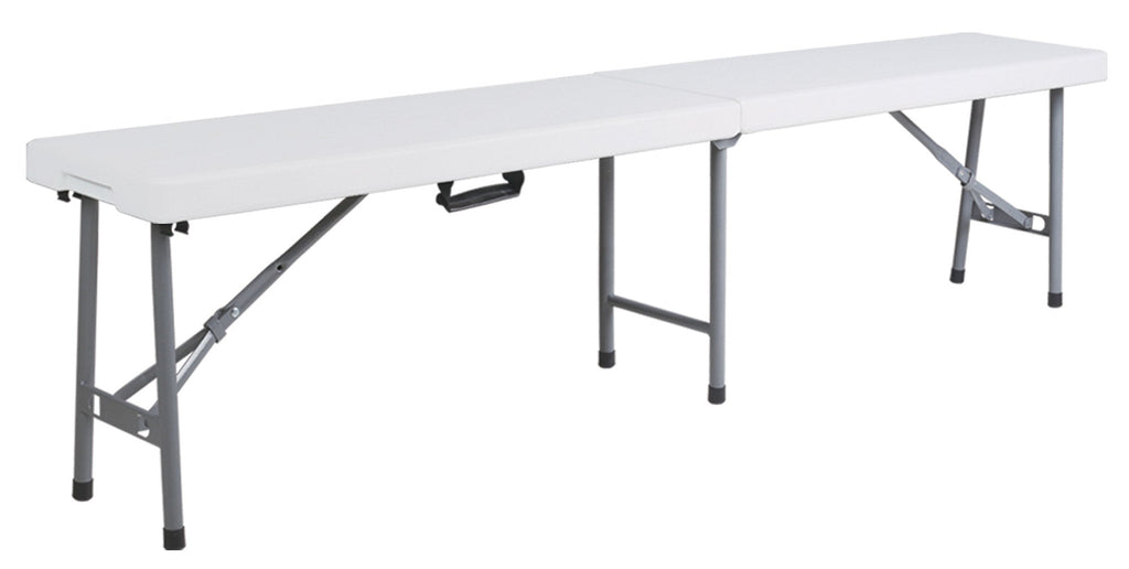 Klappbank For Catering weiß, aus hochdichtem HDPE-Propylen. Geeignet für den Innen- und Außenbereich. Platzsparende Bank, die Beine lassen sich schließen, um wenig Platz einzunehmen, wenn sie verstaut werden muss, sie wird zu einem praktischen Koffer mit Griff, um sie ohne großen Aufwand zu tragen.