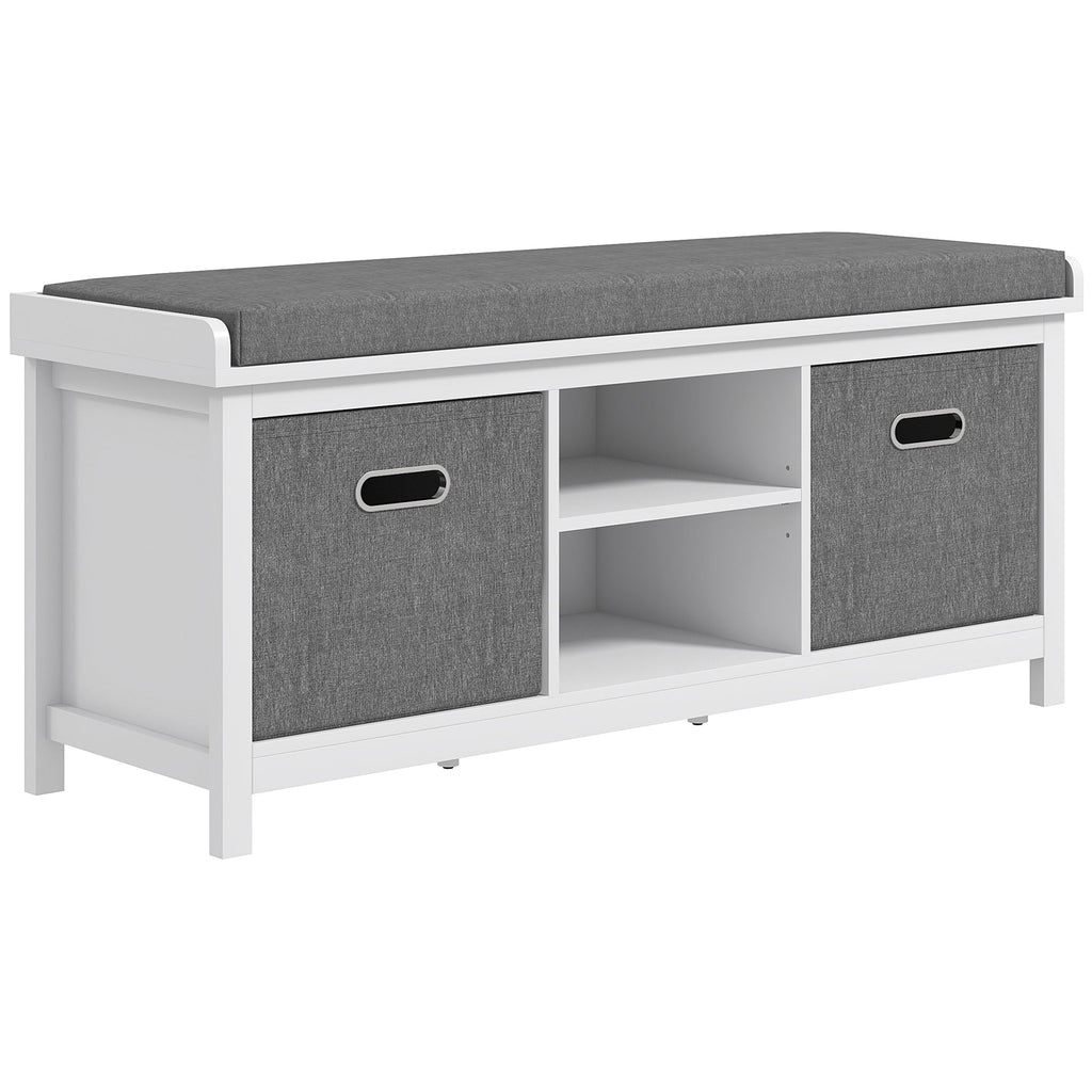 Metti in ordine tutte le tue scarpe con la nostra panca scarpiera da ingresso. I 2 cassetti in tessuto e i 3 ripiani aperti (di cui uno regolabile) offrono spazio sufficiente per le scarpe. Inoltre, il design della seduta con cuscino imbottito permette di cambiarsi le scarpe comodamente e senza preoccuparsi di restare in equilibrio. La combinazione di linee pulite bianche e tessuto grigio rende questo mobile per scarpe ottimo per arredare l'ingresso, il soggiorno o la propria camera.