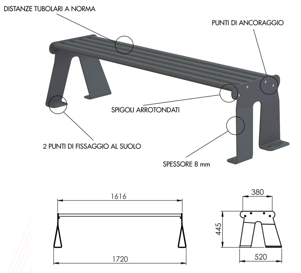 Panchina realizzata in acciaio zincato a caldo e verniciato a polvere con resina poliestere, rendendola resistente e a bassa manutenzione. Viene fornita smontata in un kit completo di accessori di montaggio e istruzioni. Può essere utilizzata in diversi contesti, come parchi pubblici, giardini privati, aree condominiali, percorsi pedonali e ciclabili, lungomare, centri storici, piazze, porti turistici, marina privata e centri commerciali.