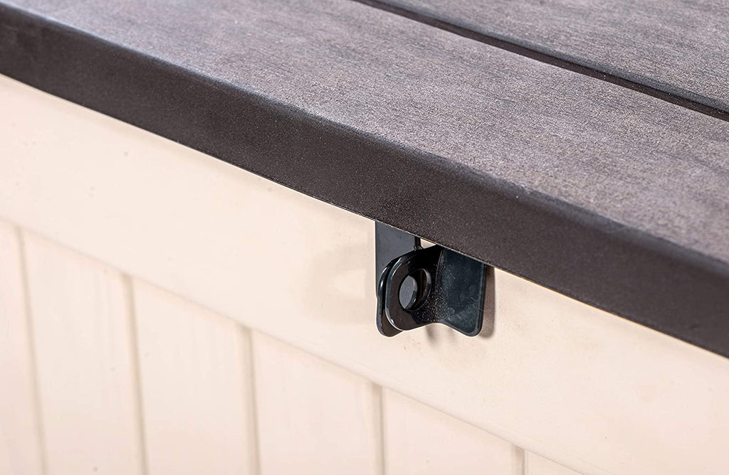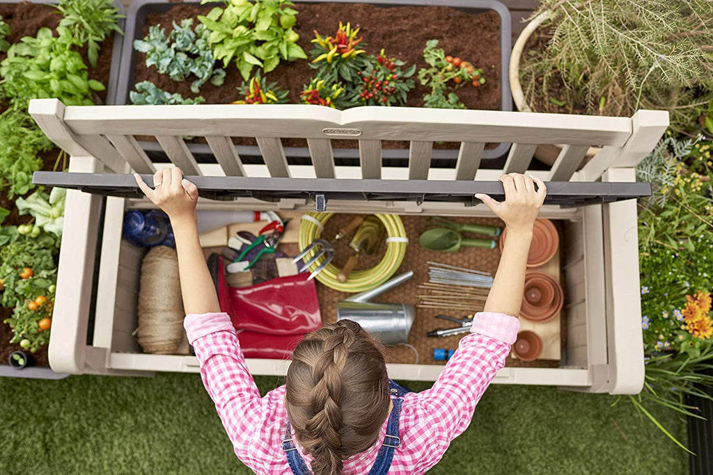 Die Truhe Eden Bench von Keter, die Design und Multifunktionalität perfekt kombiniert, ist Ihren Außenbereichen gewidmet. Die Truhe bietet zwei bequeme Sitze und ein Fassungsvermögen von 265 l, sodass alle Ihre Sachen trocken und sauber bleiben. Die Truhe ist aus witterungsbeständigem und verschleißfestem Harz gefertigt, wodurch Sie sehr wenig Wartung benötigen und Ihnen gleichzeitig das Vergnügen bieten, natürliches Holz zu berühren und zu sehen.