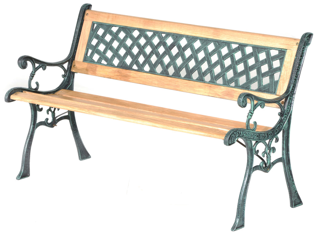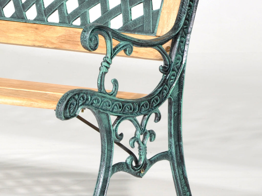 Zweisitzer-Bank mit Armlehnen aus Gusseisen und naturfarbenem Hartholz.
