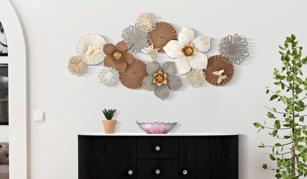 - Il pannello da muro Broty è un'opera decorativa 3D con elementi naturali e colori delicati