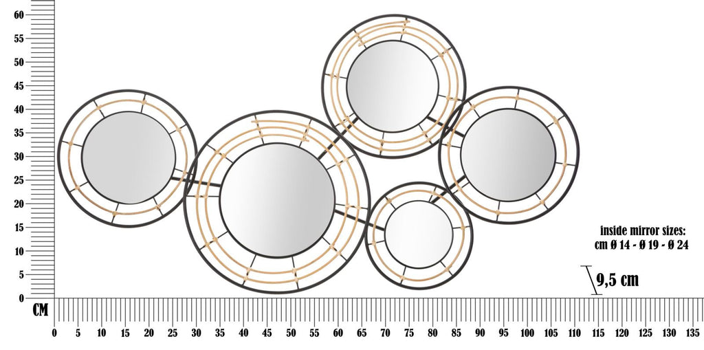• Il pannello da muro è composto da cerchi di diverse dimensioni con specchietti e finiture in rattan