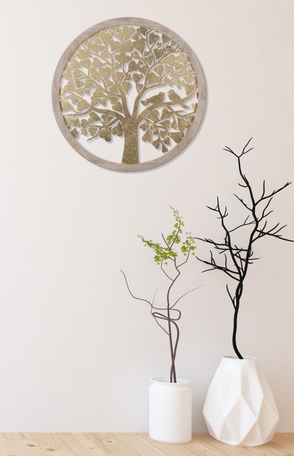 Goldene Baumplatte aus Metall mit rundem Holzrahmen. 3D-Paneele sind der neue Trend für die Dekoration von Wänden. Metall wird in geometrischen, pflanzlichen oder tierischen Formen abgelehnt, die jeder Umgebung einen glamourösen und überraschenden Reiz verleihen